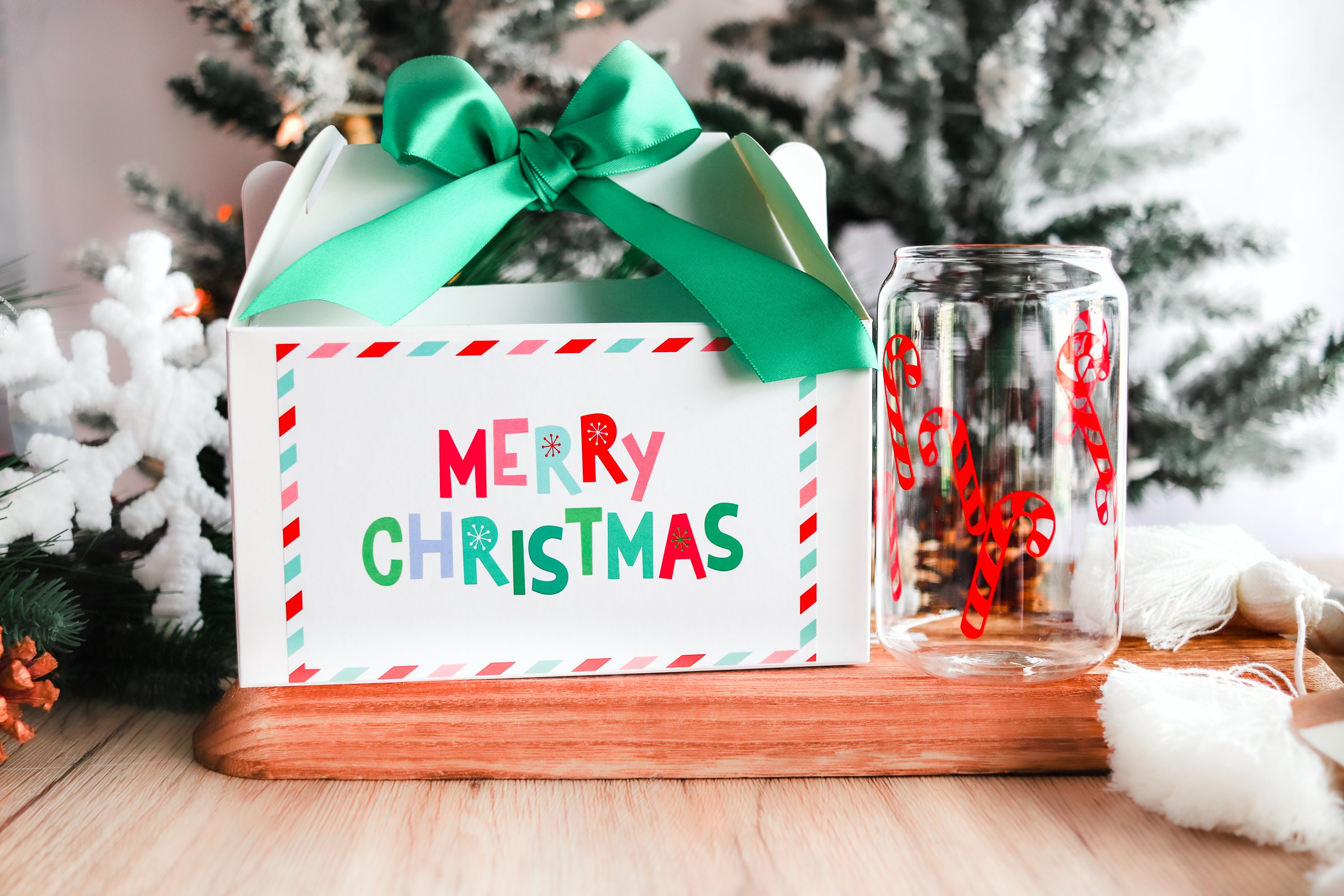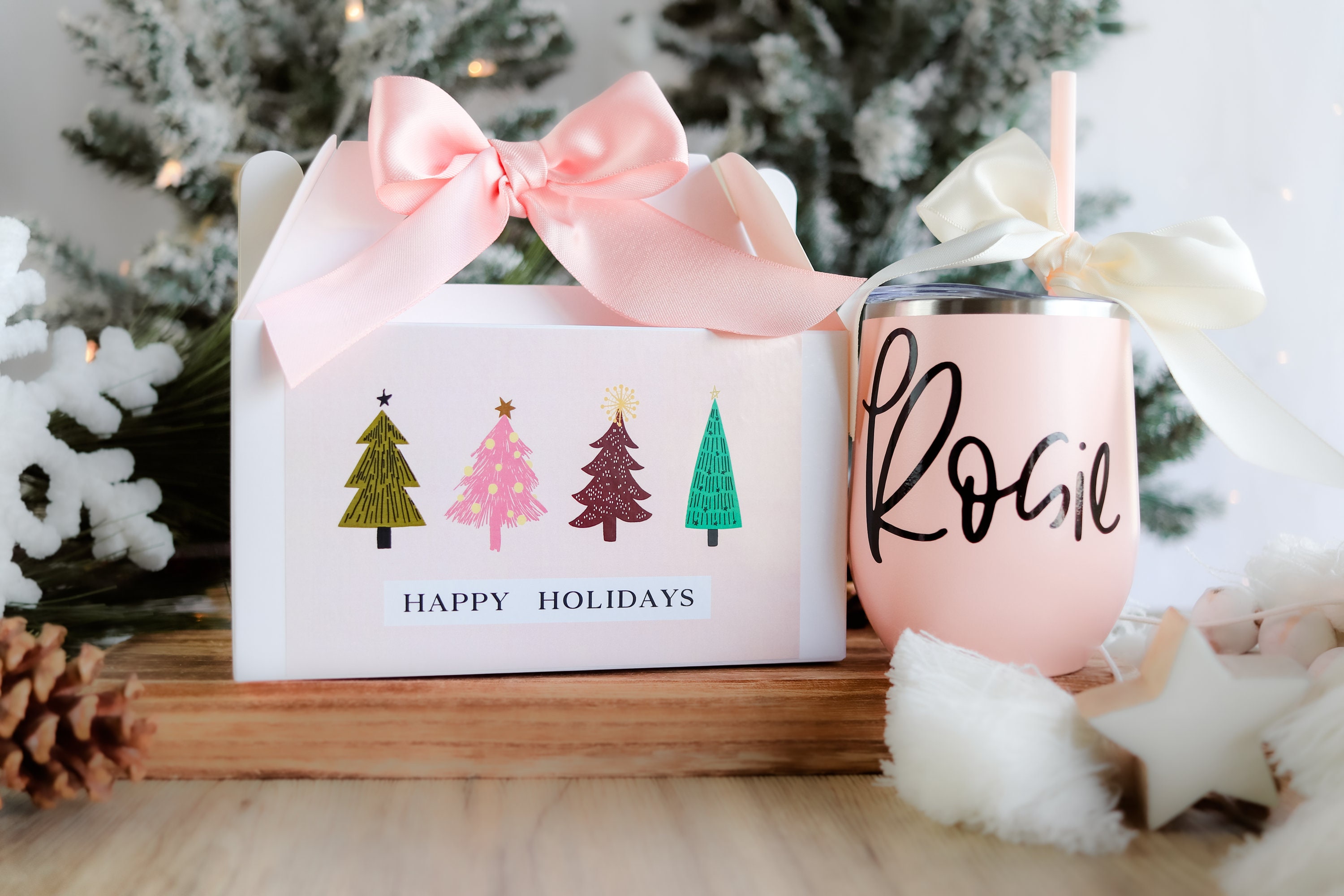 Boho Christmas trees, Christmas Box, Christmas gift set, Christmas gift box, gift for her personalize Wine Glass Christmas beer can glass