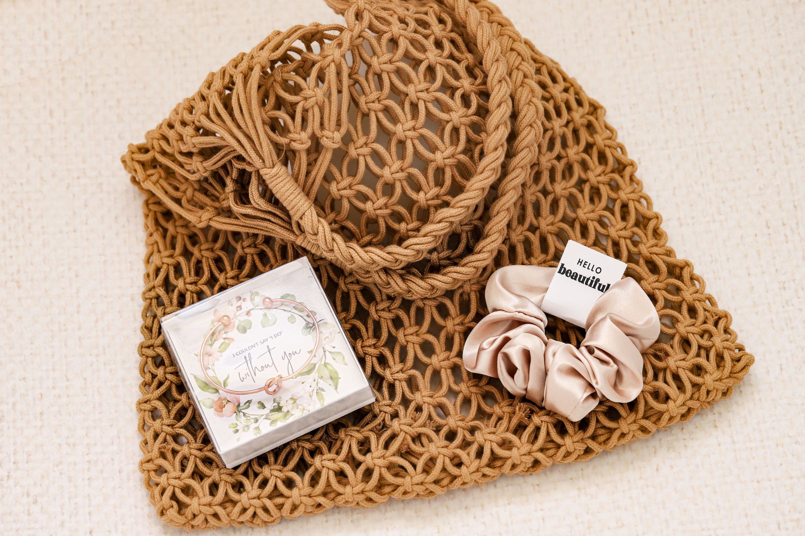 • Scrunchie with tag. Terracota, Tan, Dusty Blue, Sage, Blush, Ivory, Burgundy, Lime Green