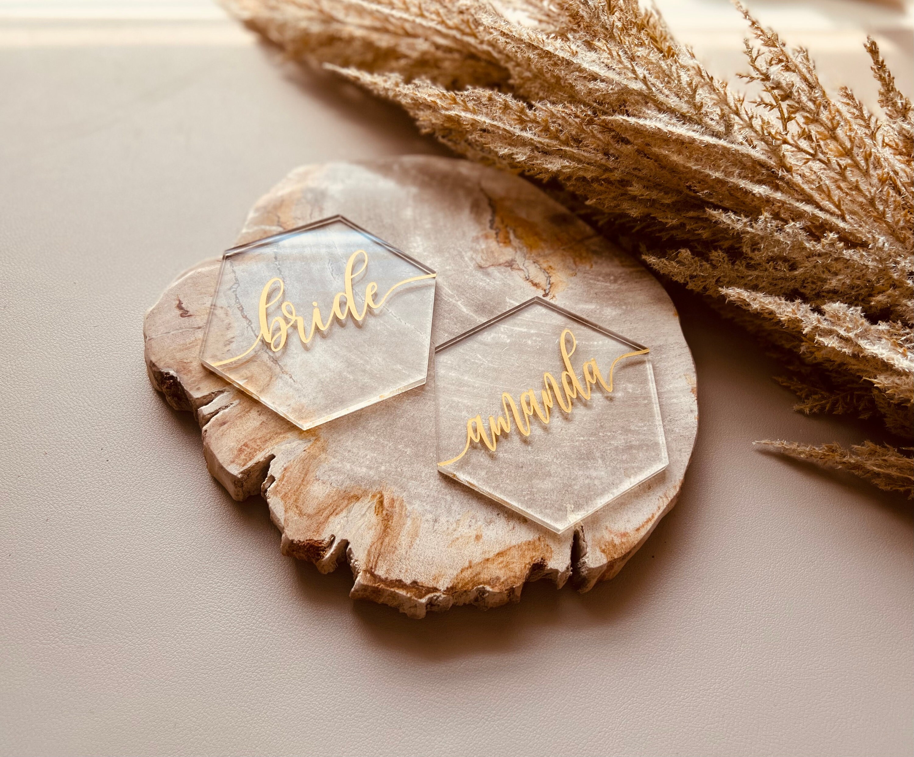 Our place cards are laser cut 1/8" clear acrylic personalized with the color of your favorite color vinyl for a modern look. Option for hand painted background