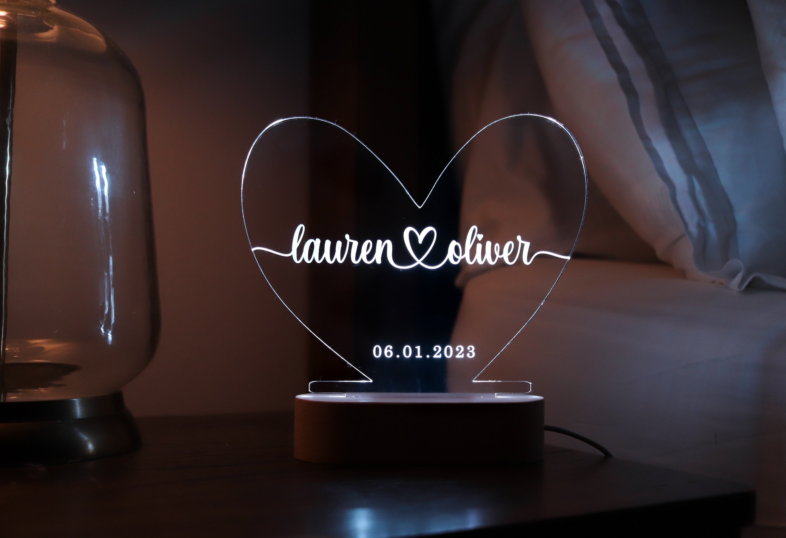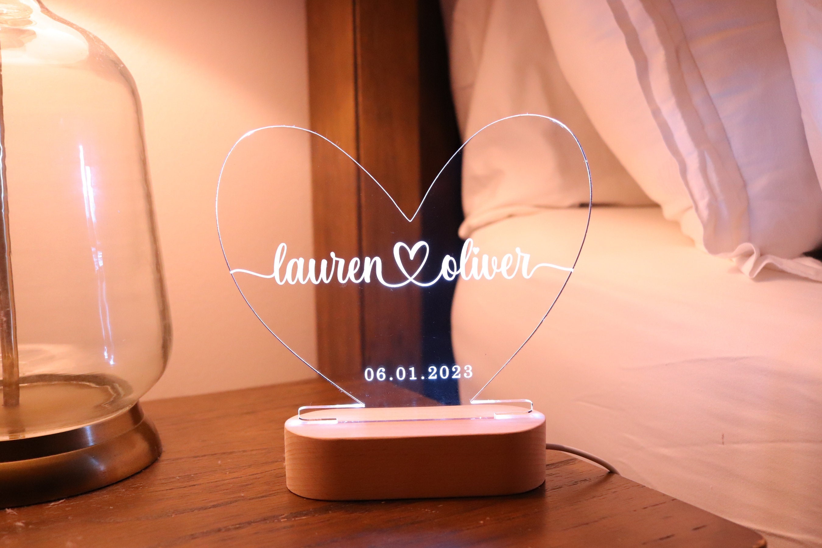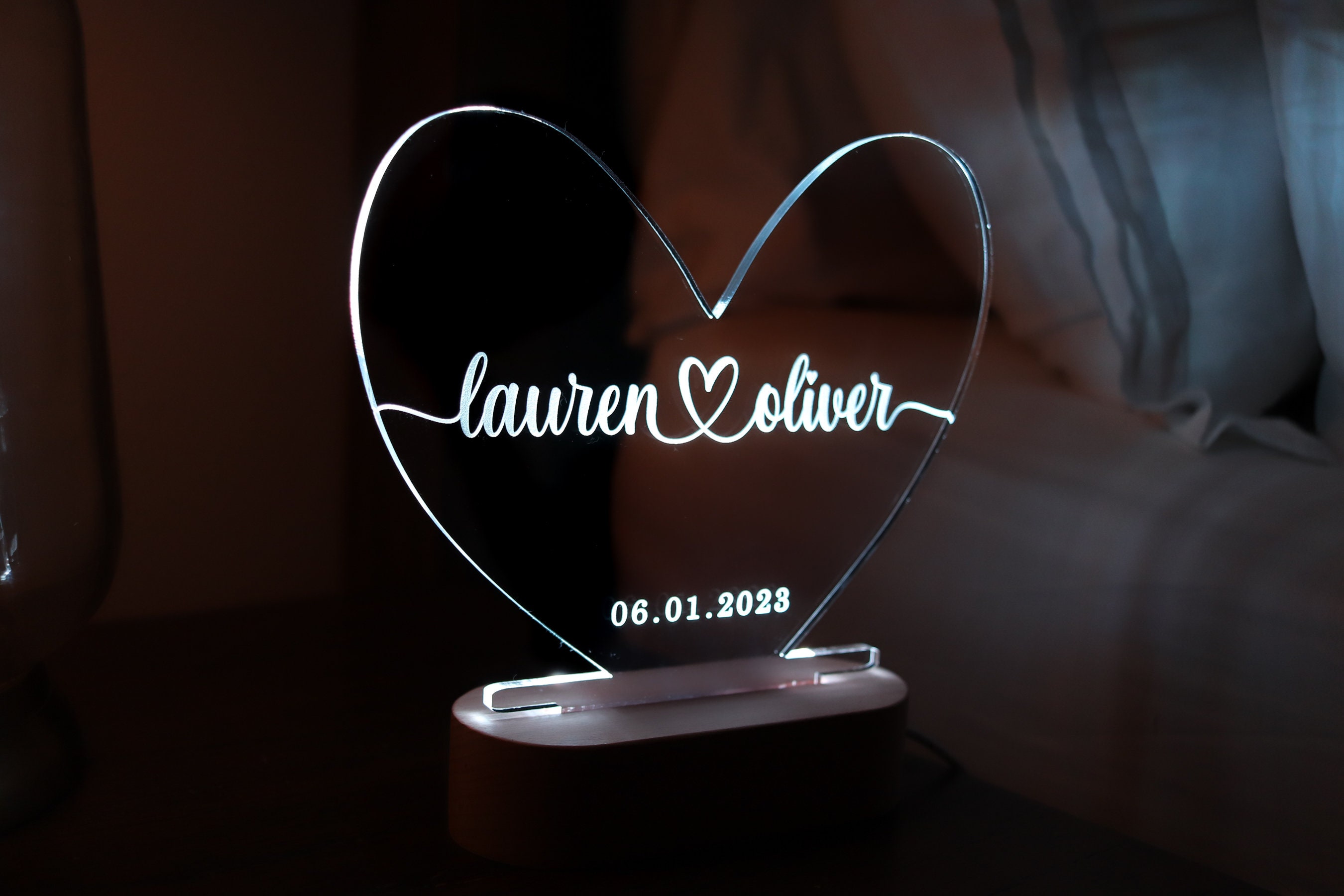 Heart shape night light with names and date engraved, perfect gift for him, for her, engagement, anniversary, valentines and more. Sweet night.