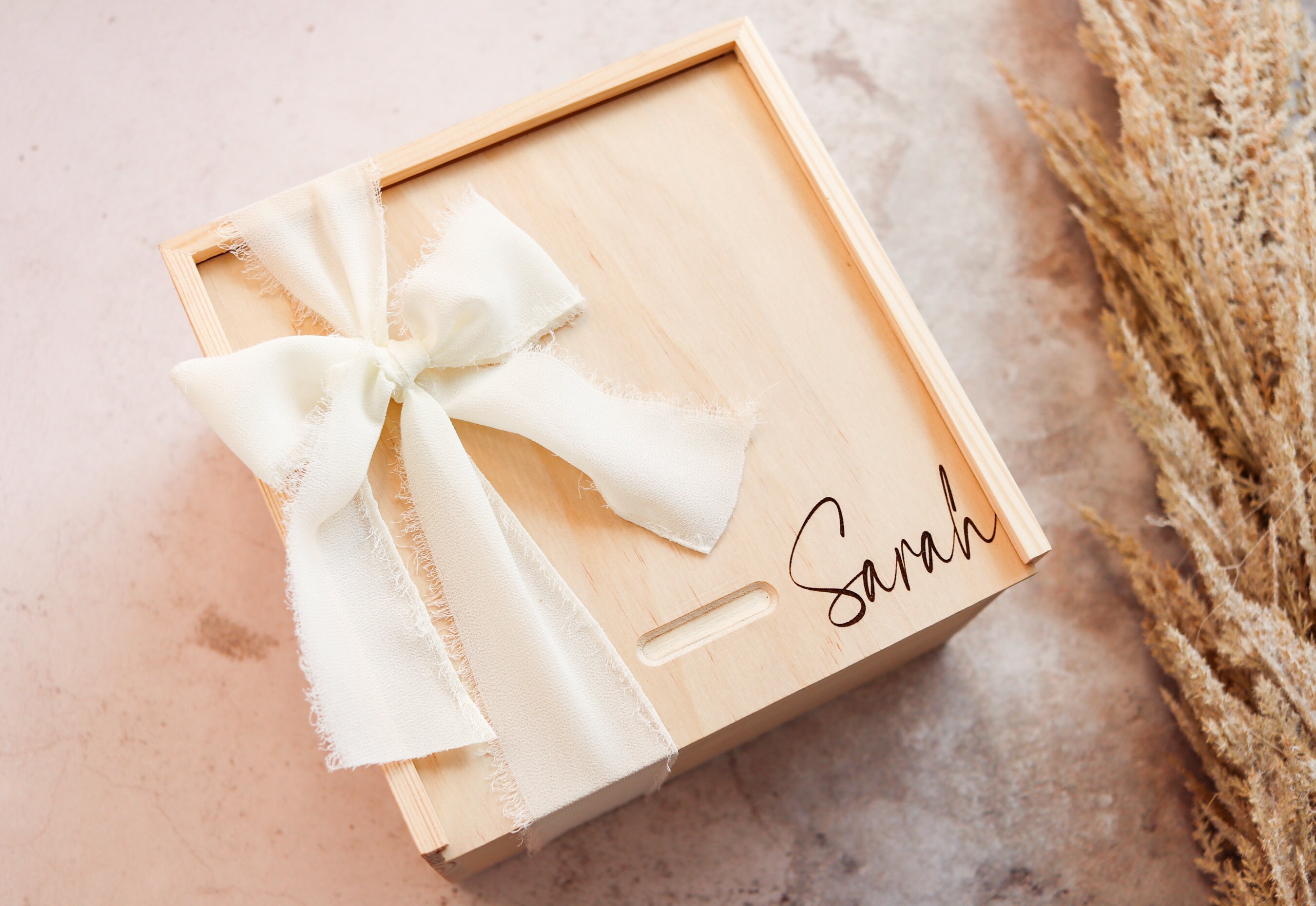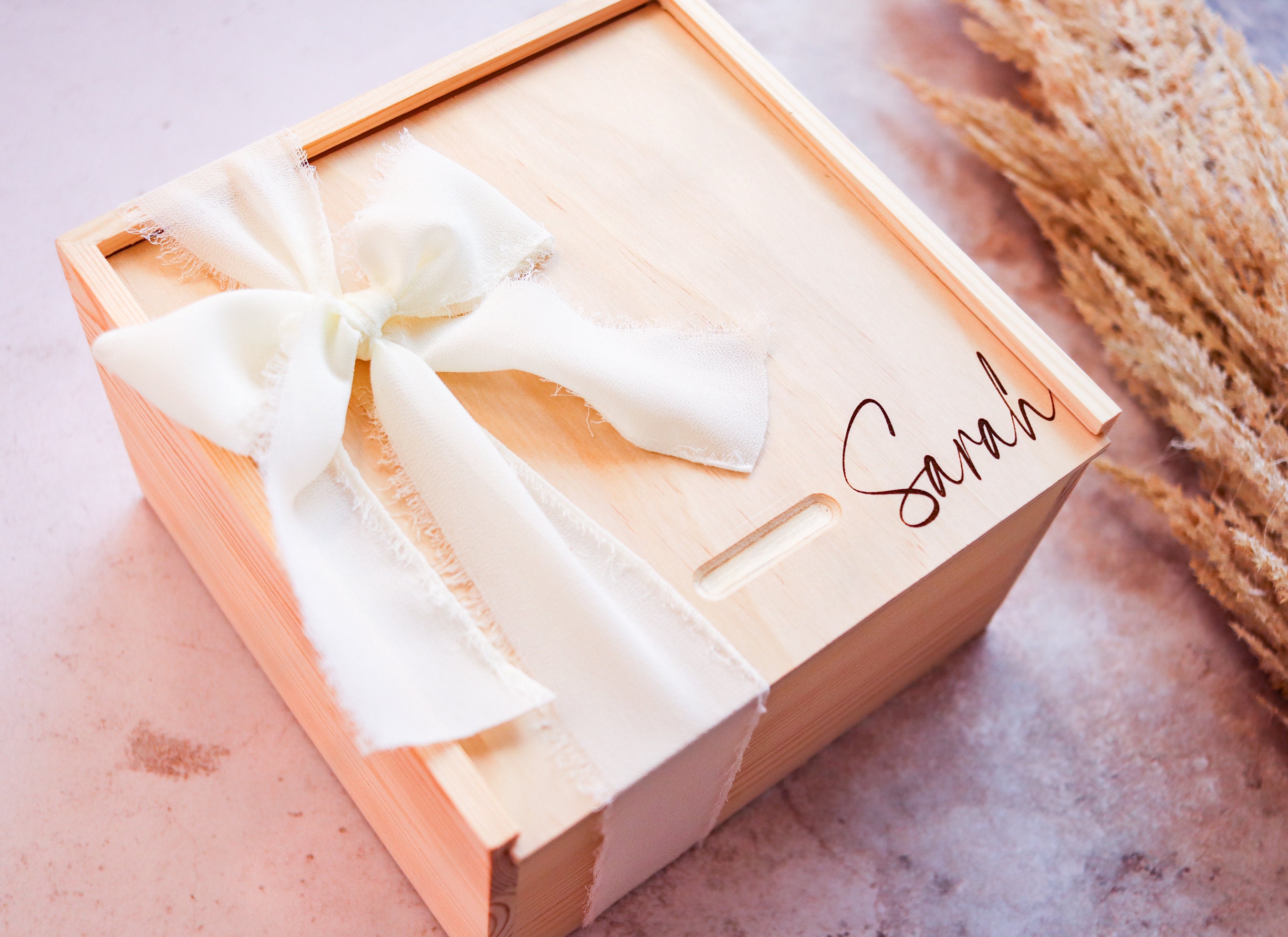 Box is made from a raw light pine wood with a slide in lid with SILK ribbon.