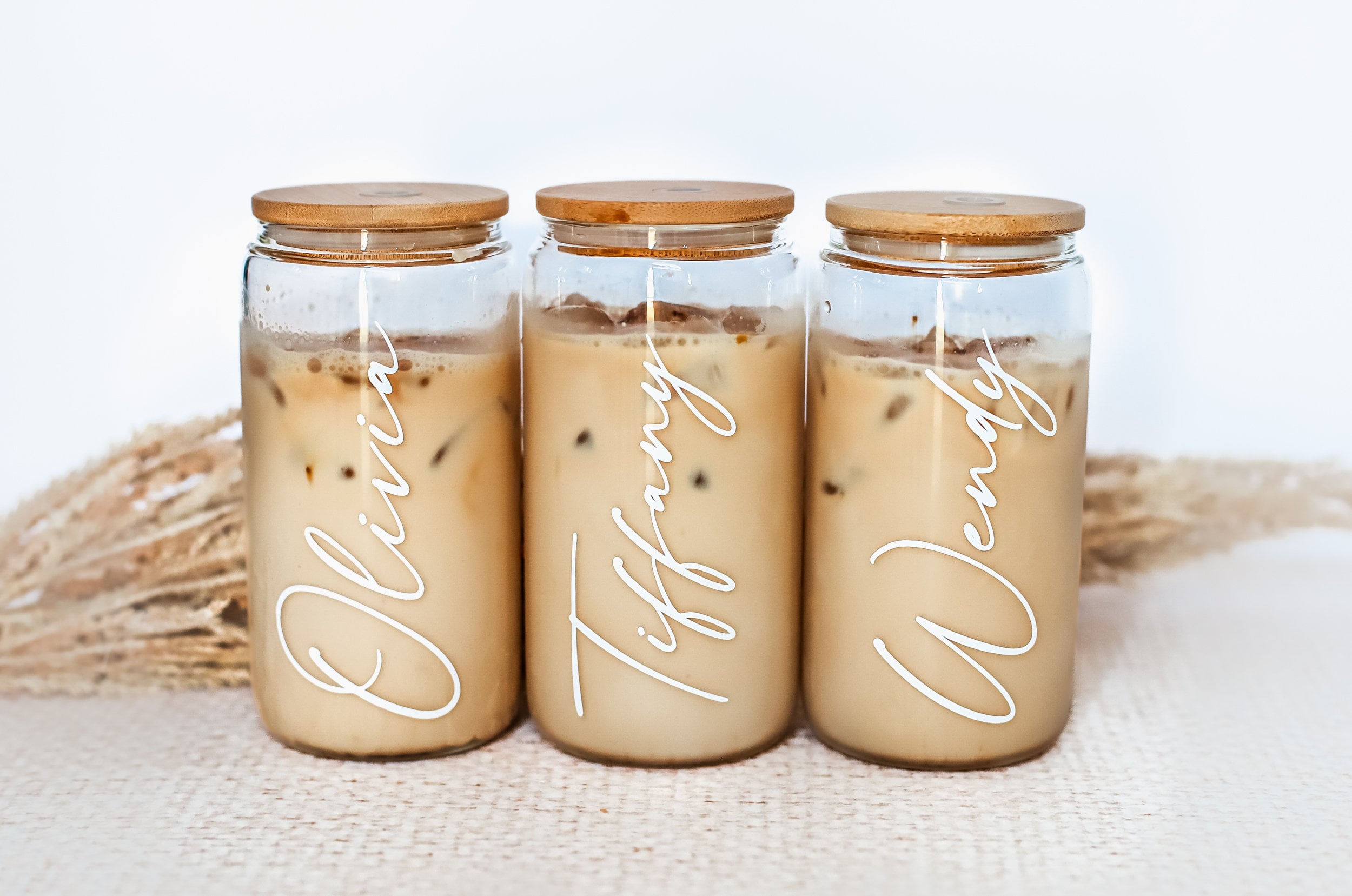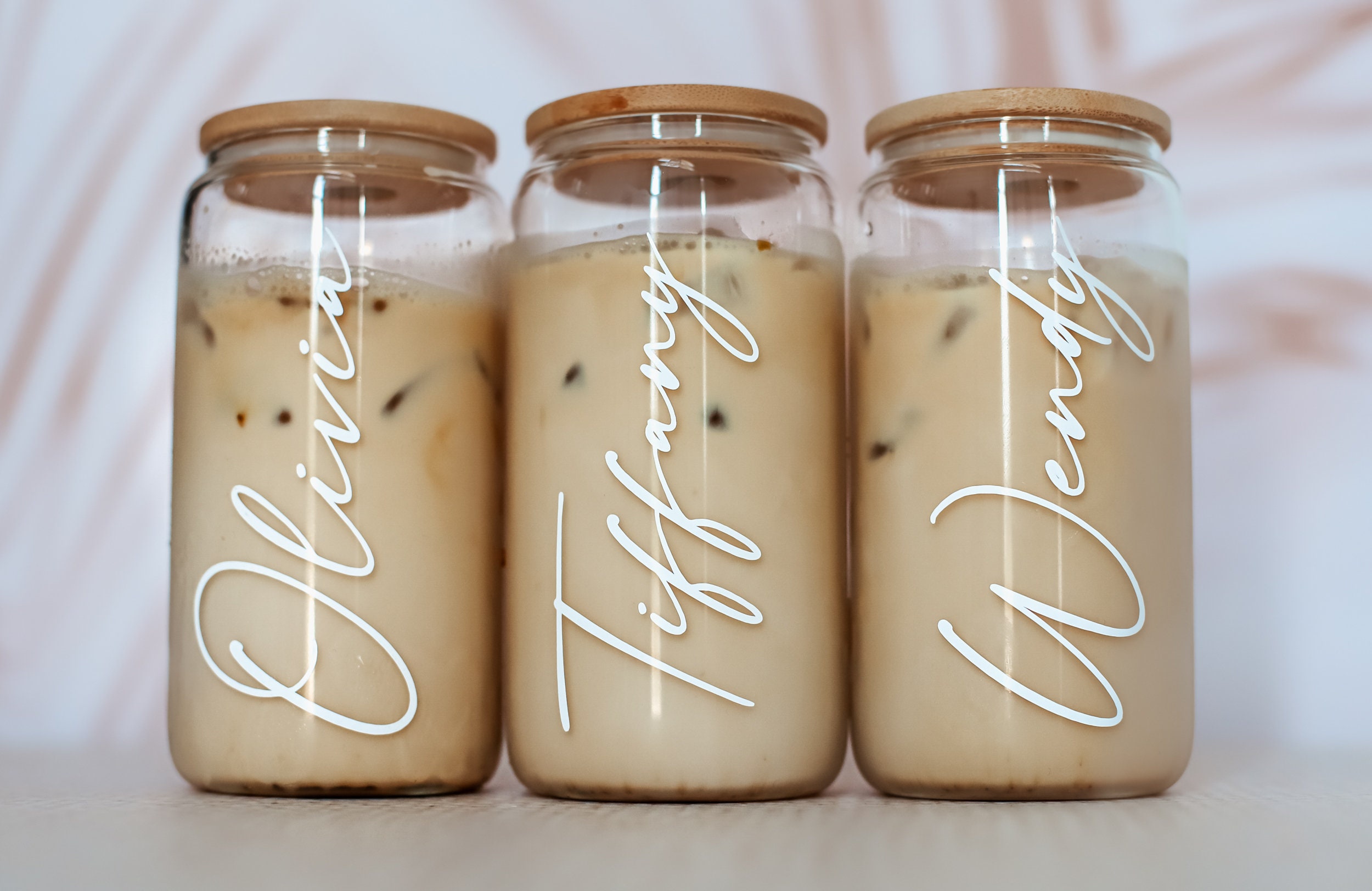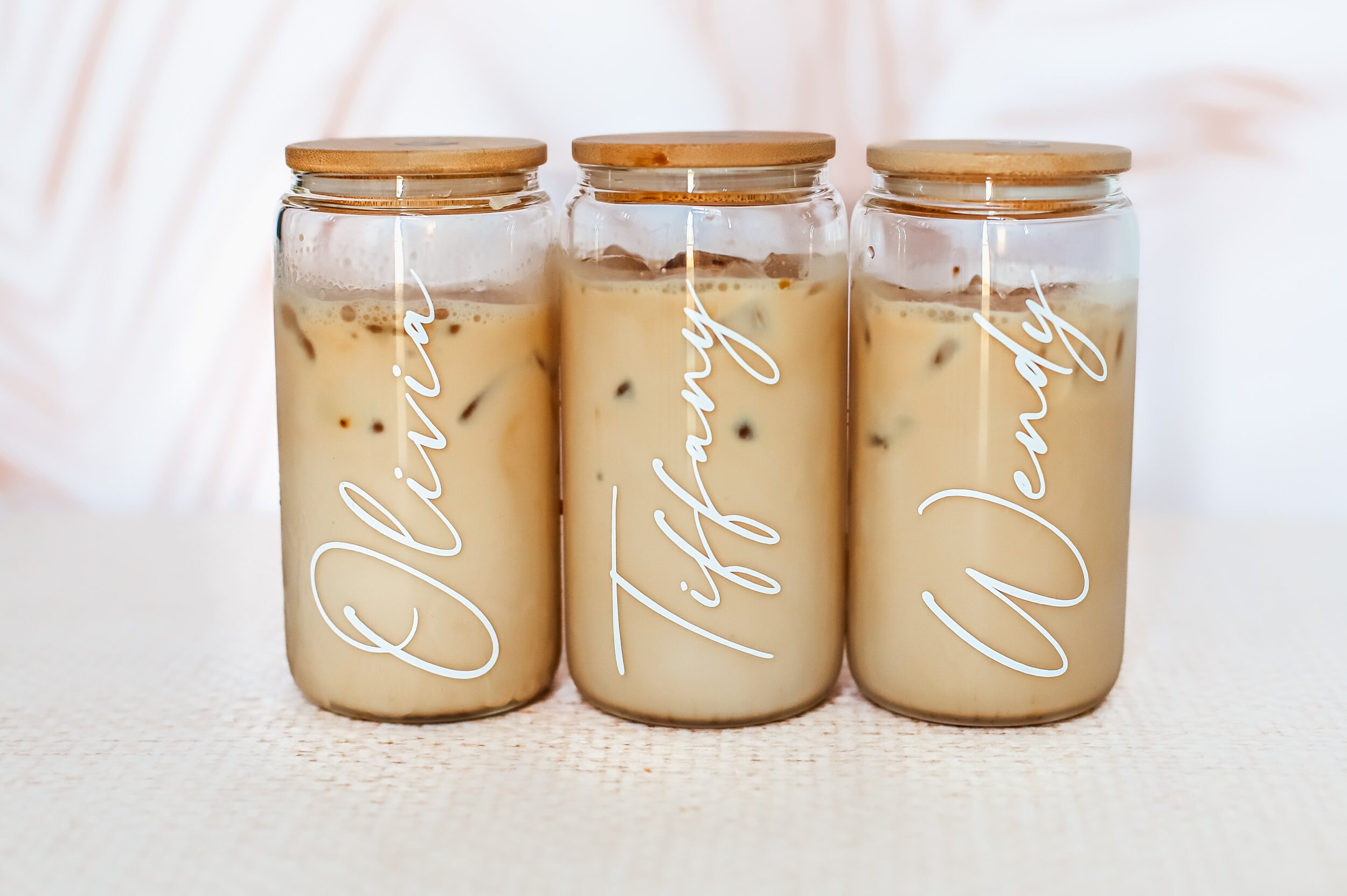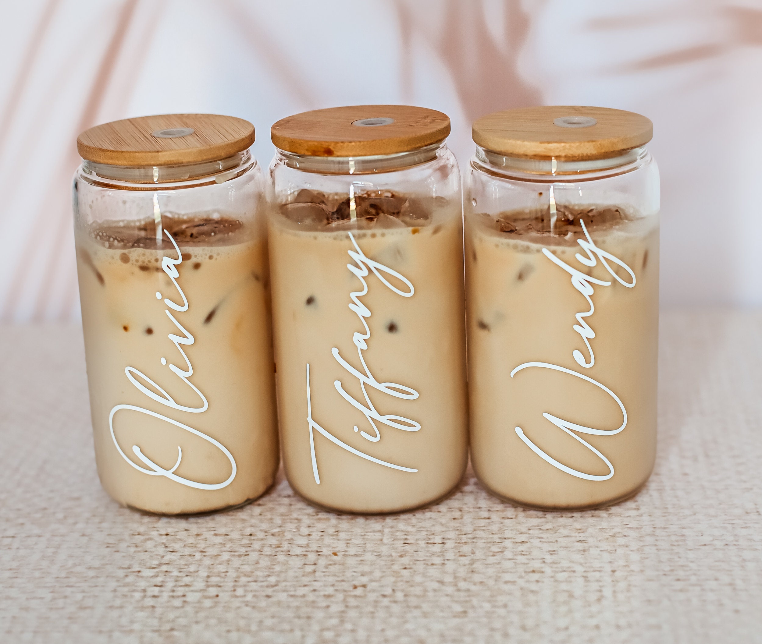 Personalized iced coffee cups make the perfect gift for bridesmaids, friends and family. Each glass mug is personalized with her name in white vinyl.