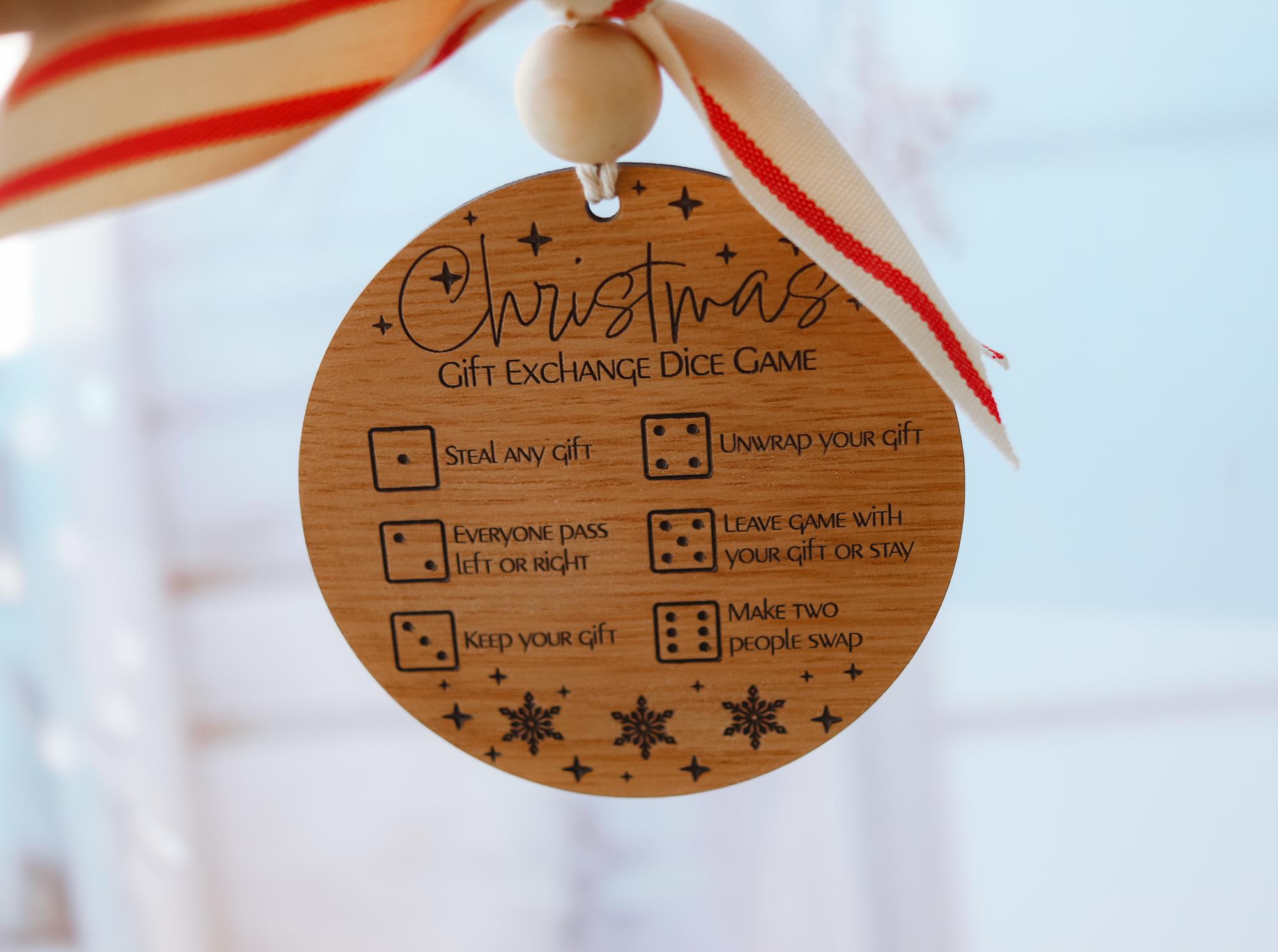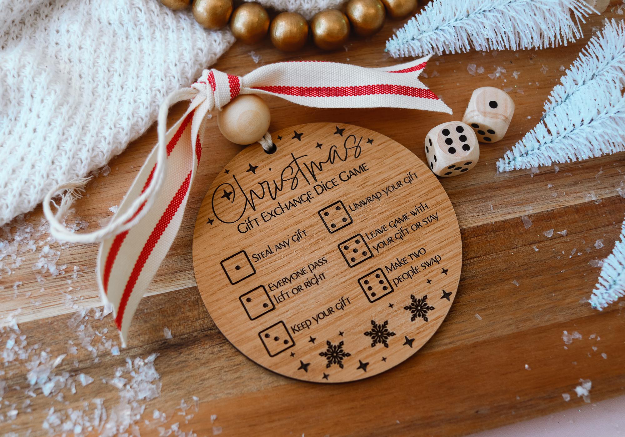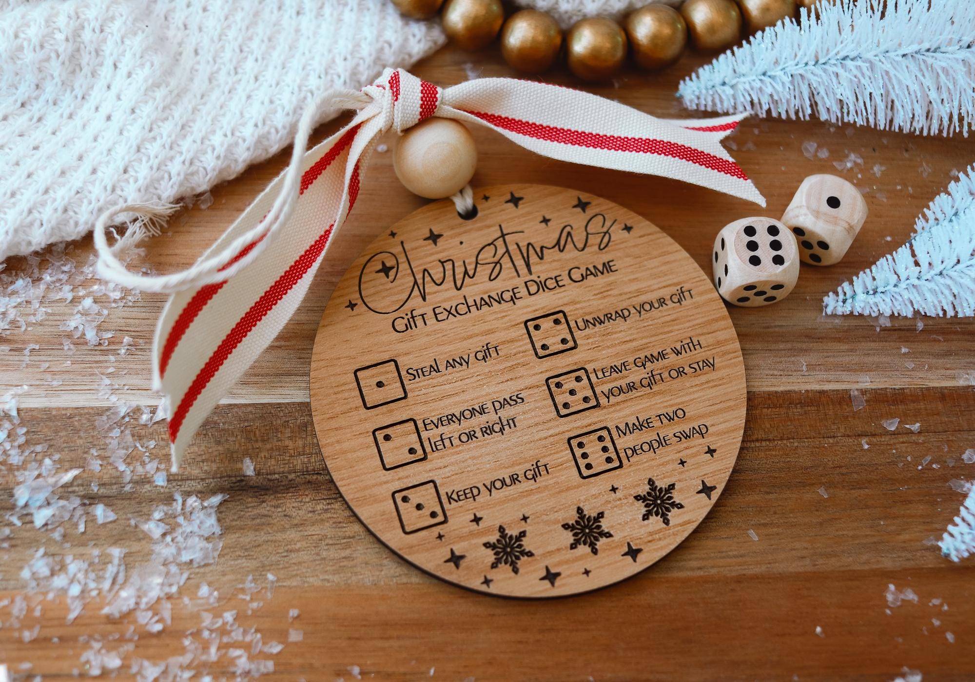 Add excitement to your holiday gift exchange with this beautifully crafted Christmas Dice Gift Exchange Game! Perfect for family gatherings, office parties, and Secret Santa events, this game is engraved on a durable wooden disc with clear, festive instructions for rolling the dice and swapping gifts. Compact and portable, it makes a delightful stocking stuffer or a unique holiday gift. With its charming design and playful spirit, this game is sure to bring joy and laughter to any celebration. Includes two dice and festive ribbon for a complete holiday experience.