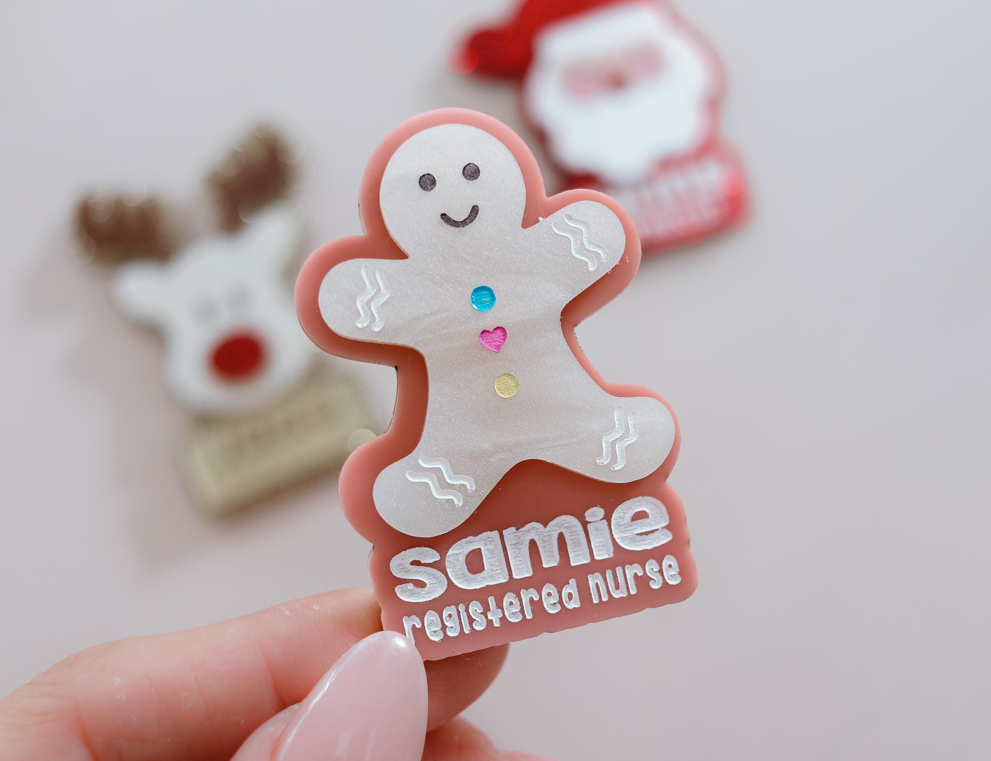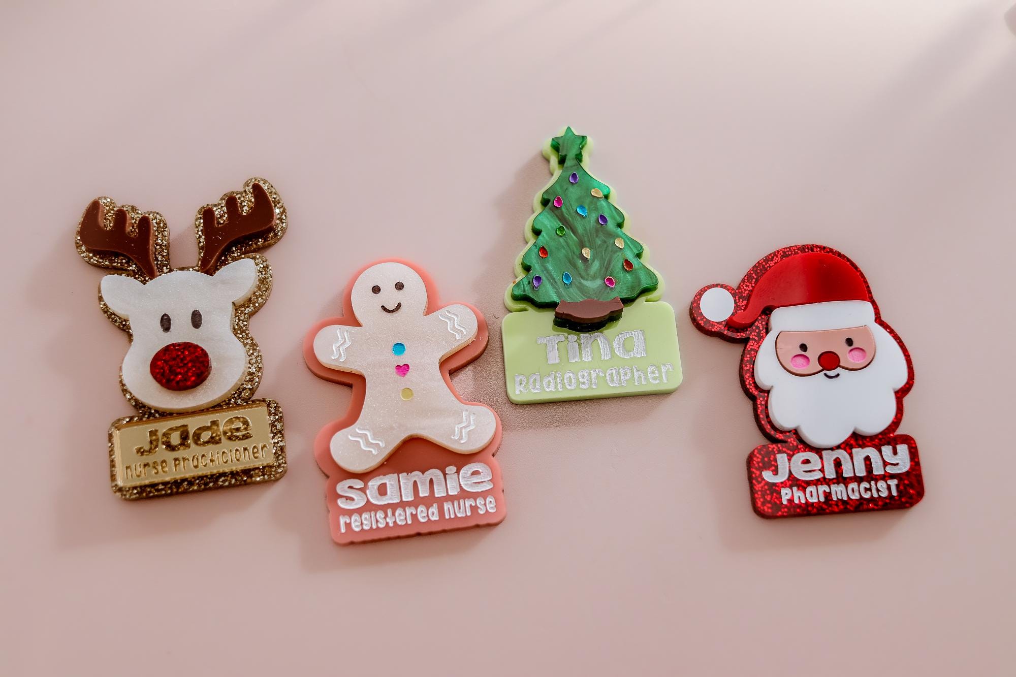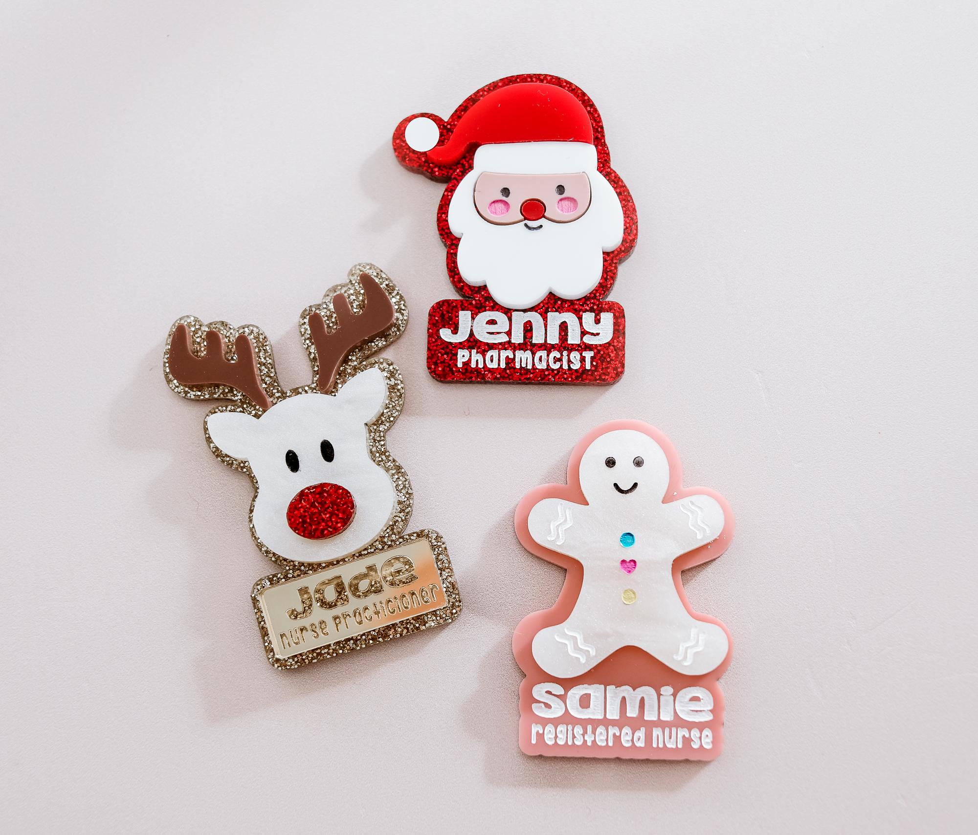 Spread festive cheer at work with these adorable custom name badge clips! Featuring charming holiday designs like Santa, reindeer, and gingerbread, christmas tree, these clips are perfect for adding personality to your uniform. Each badge is personalized with your name and title, making it a functional and fun accessory. Choose from three backing options—reel, magnet clip, or Velcro—for maximum convenience. Perfect for nurses, pharmacists, teachers, or anyone looking to celebrate the season in style!