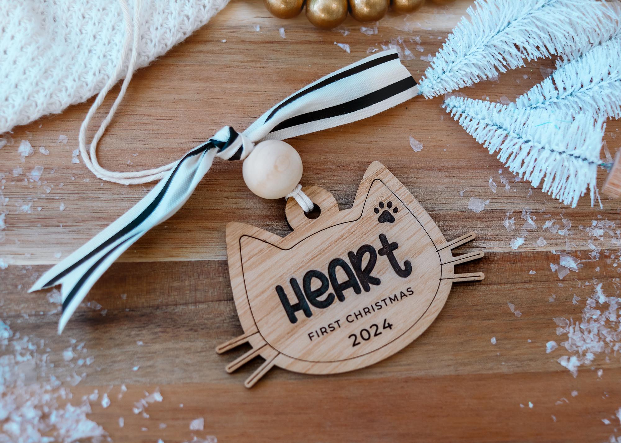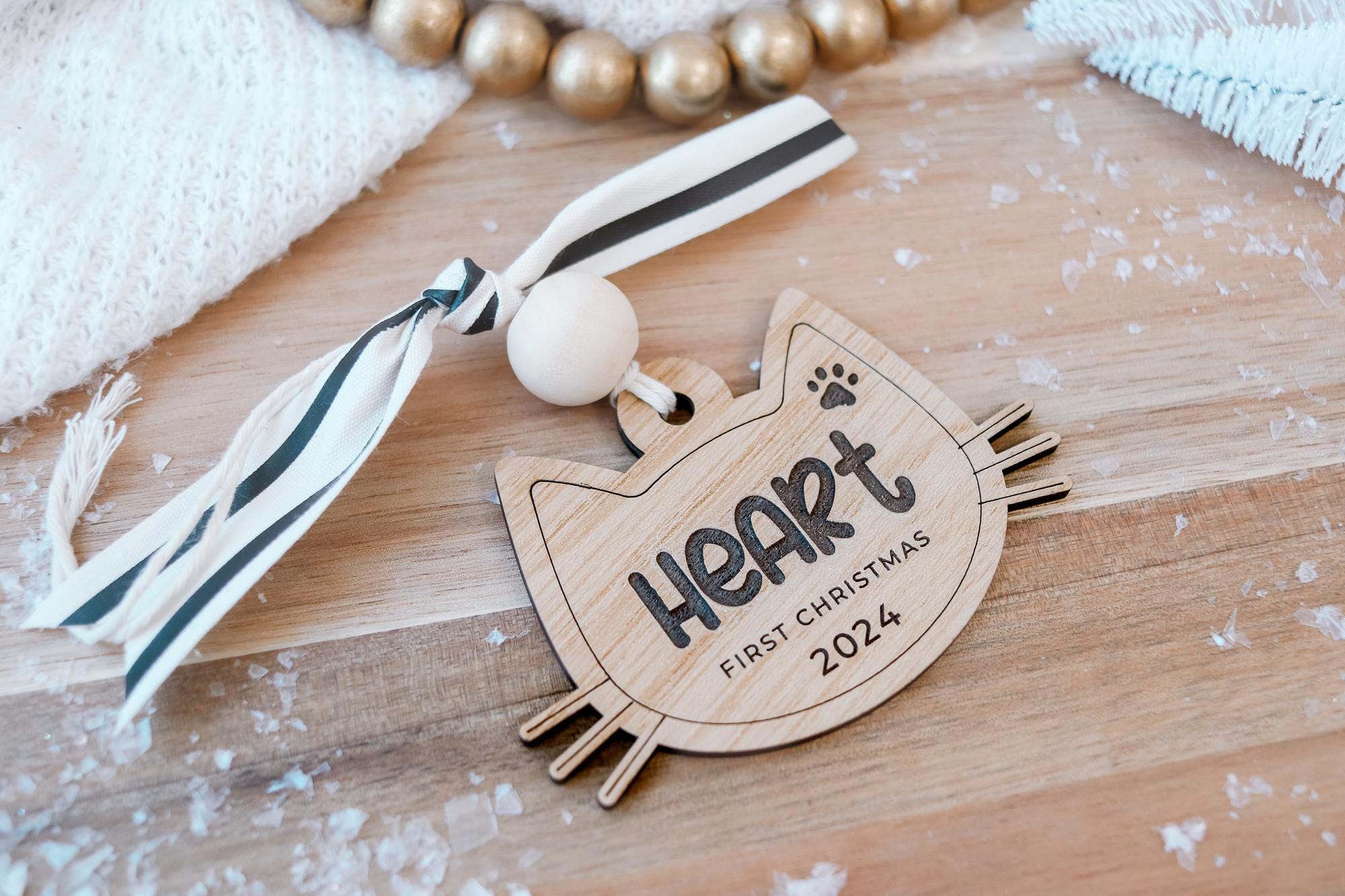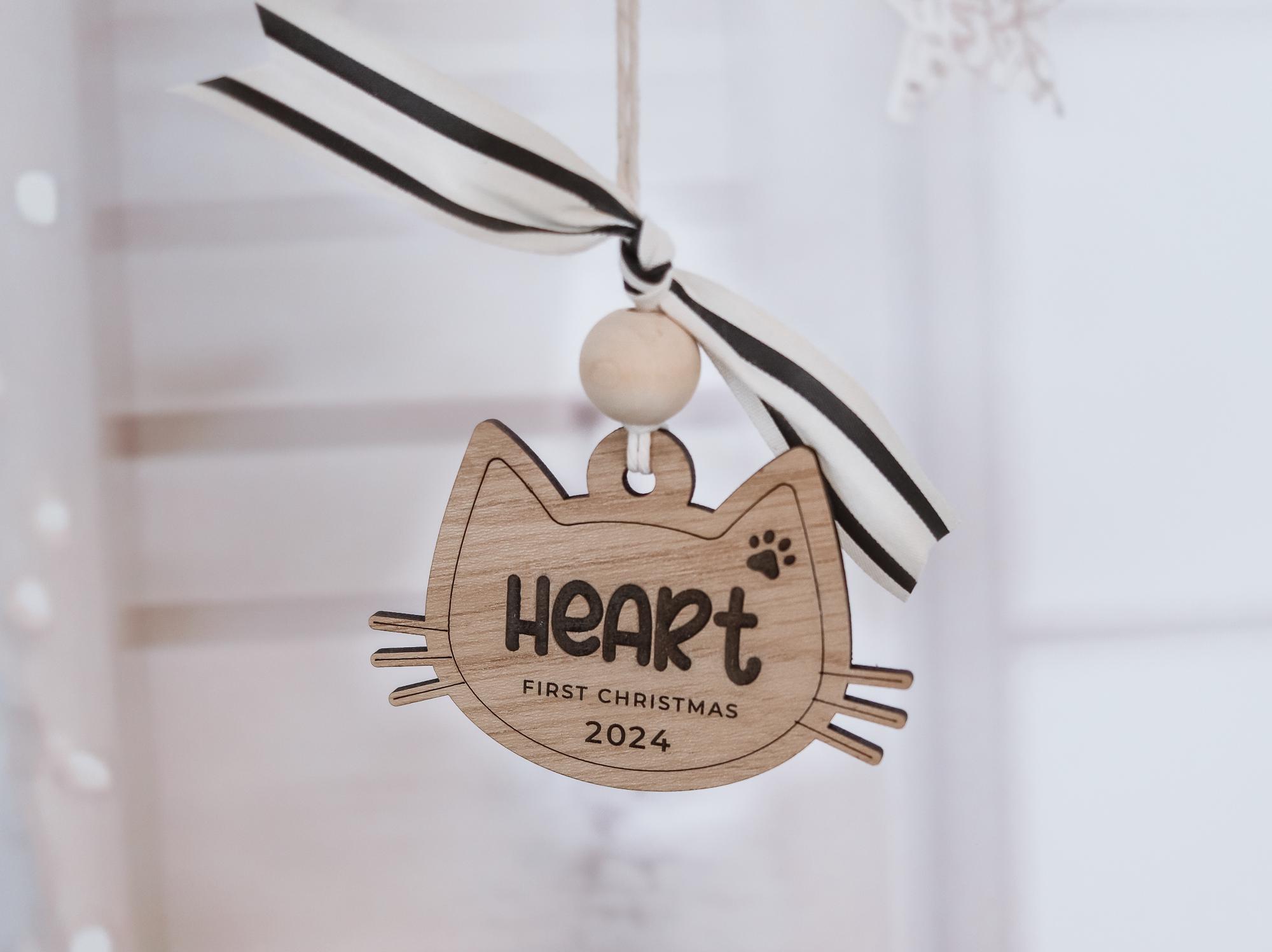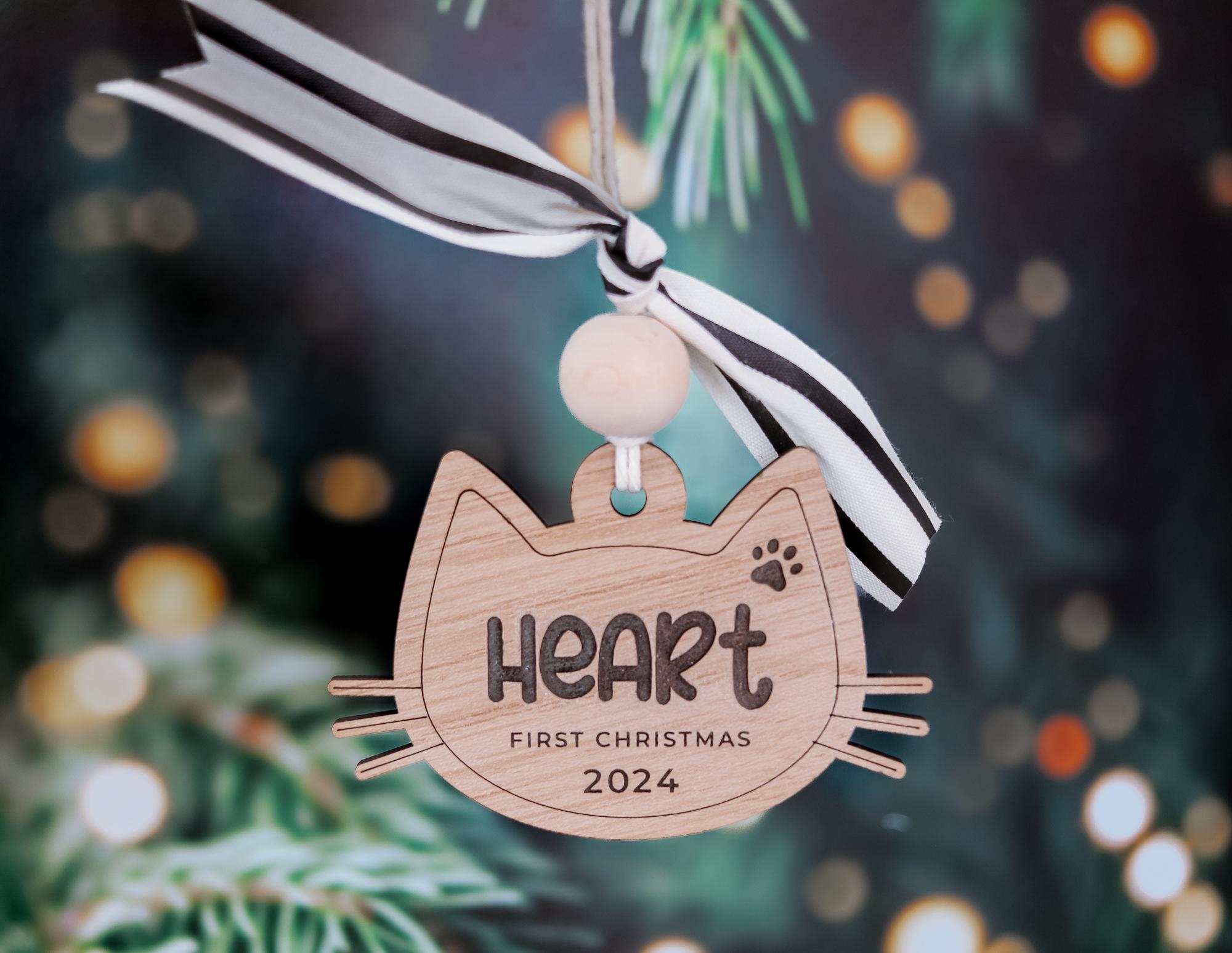 Celebrate your furry friend’s first Christmas with this adorable, personalized cat ornament! Made from natural wood, this ornament is crafted in the shape of a cute cat face, complete with engraved details and your pet's name. It’s the perfect way to honor your pet’s first holiday season and add a touch of warmth to your Christmas tree decor. Featuring a rustic wooden bead and striped ribbon for hanging, this ornament is both stylish and heartfelt, making it a treasured keepsake for years to come.
