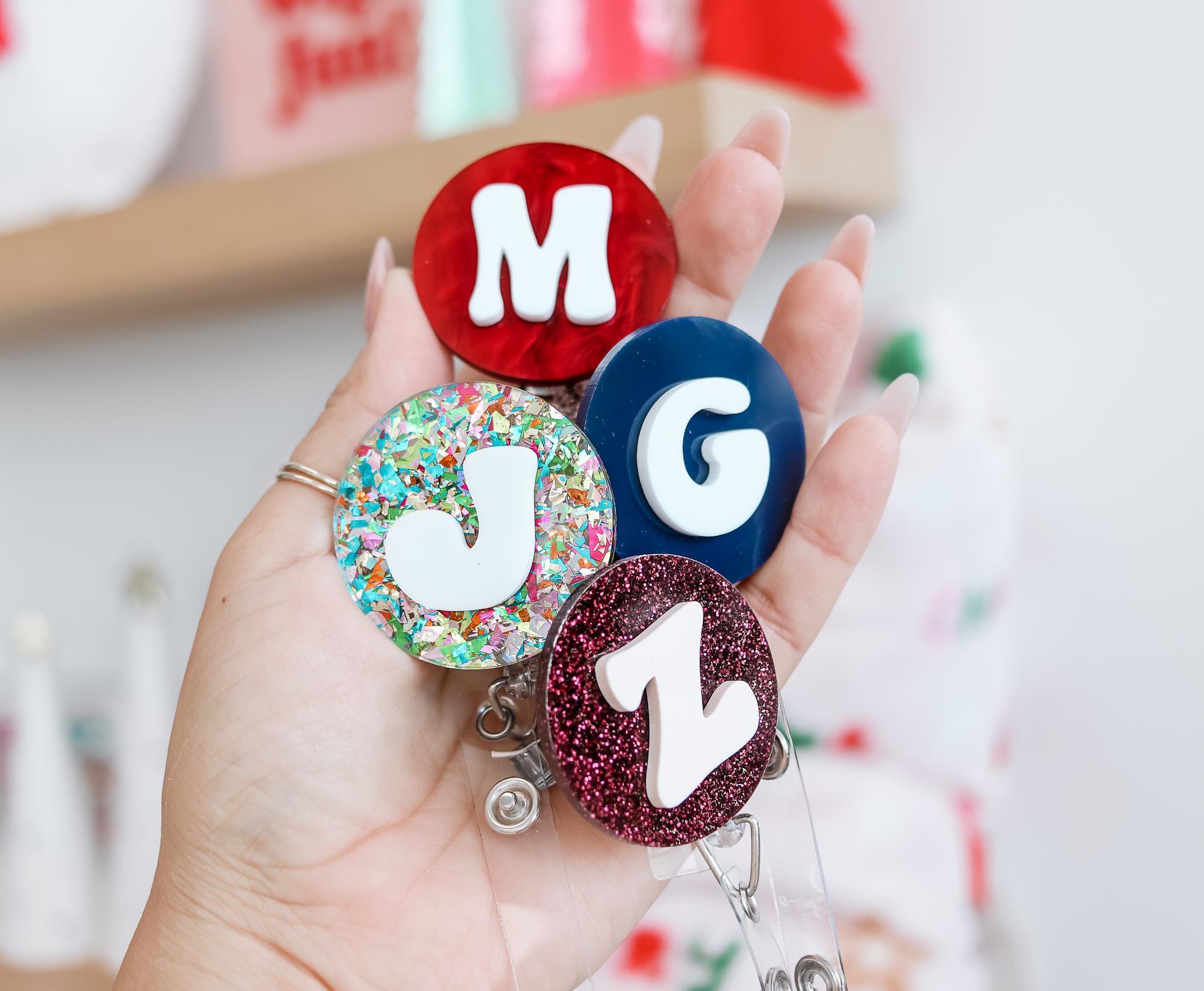 Stay stylish and functional at work or school with this custom badge reel! Each badge reel is personalized with your chosen initial in a fun font style and comes with your preferred background and font color options.