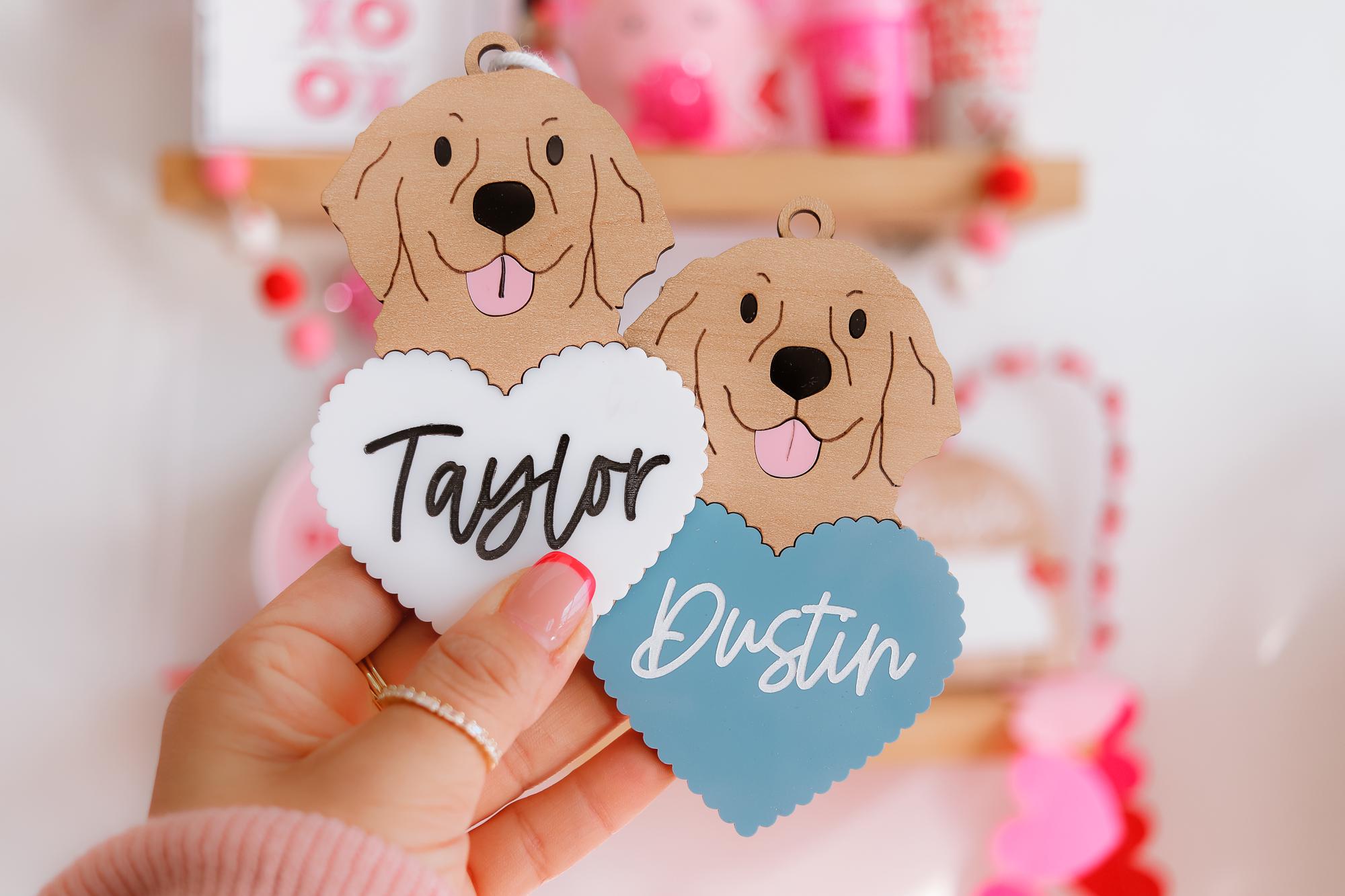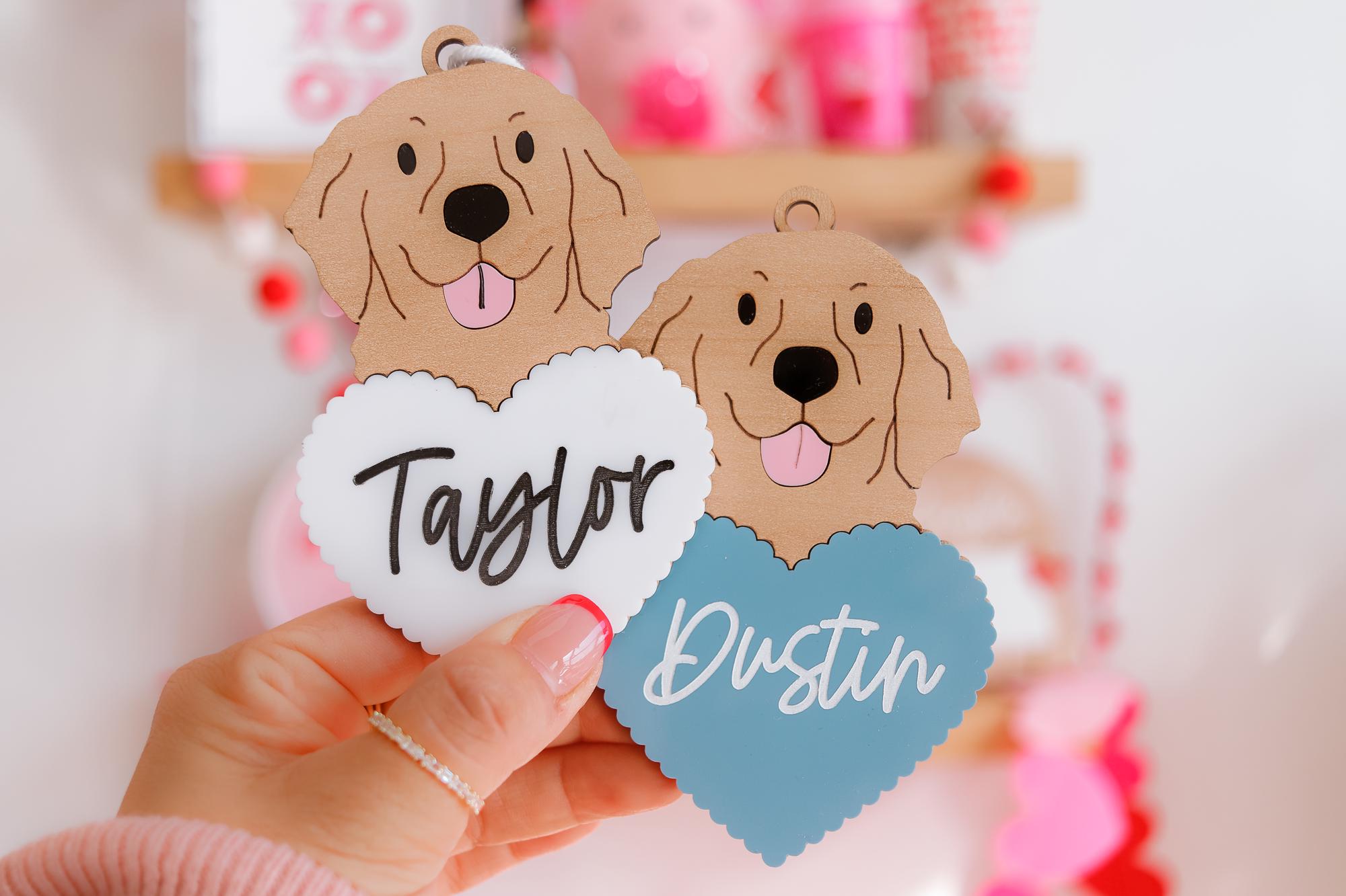 Ask a questionValentines dog tag, dog lover name tag, golden retriever bag charm, Valentines name tag for boy, valentines gift for dog lover, puppy name