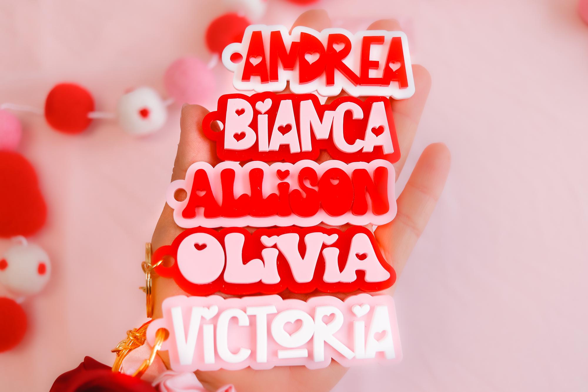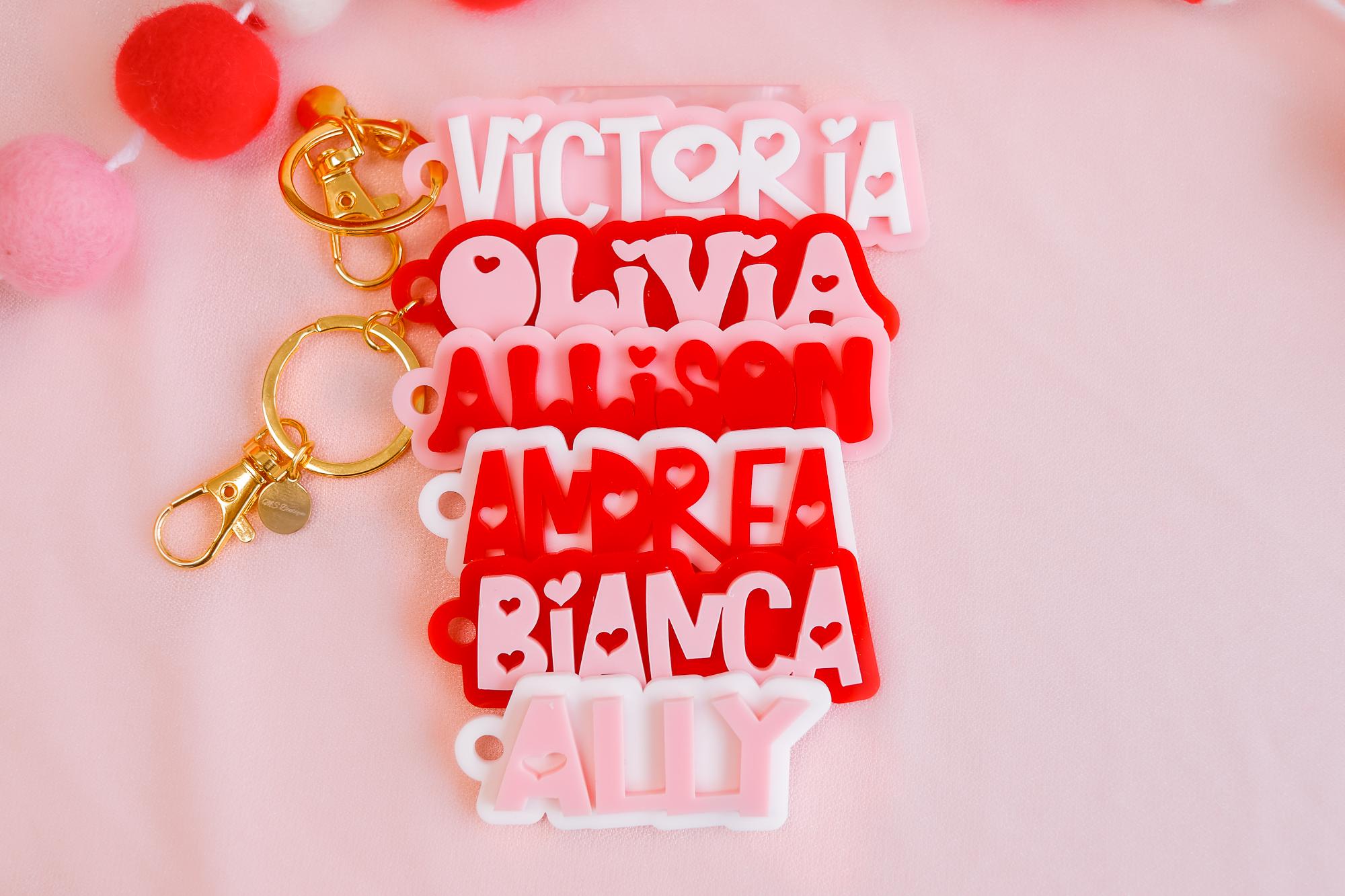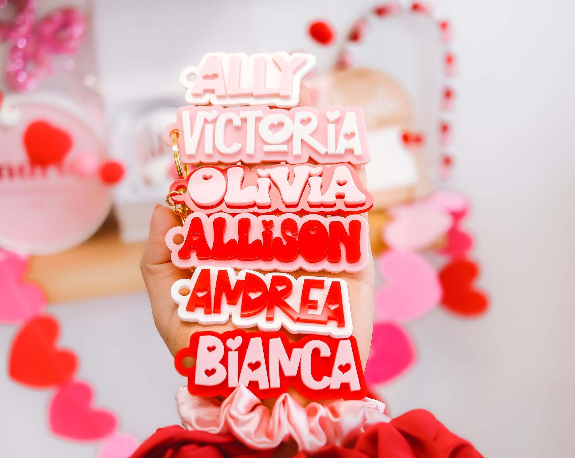 Celebrate love with these adorable Valentine's custom name keychains! 💖 Perfect for gifting or personal use, these keychains add a pop of charm and personalization to your everyday essentials. Crafted with vibrant acrylic, each keychain is designed with a bold, playful font and delightful heart accents to capture the Valentine's spirit.