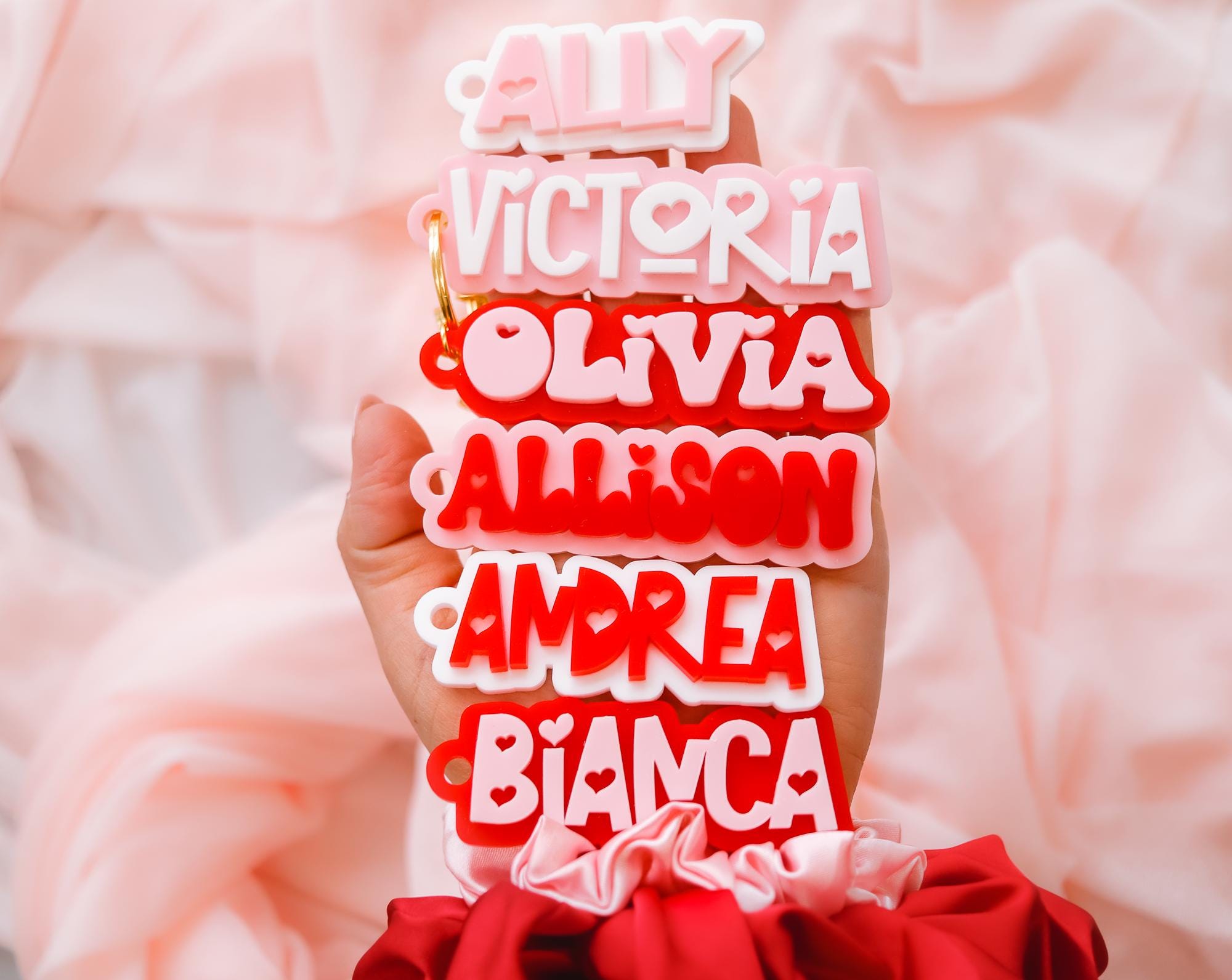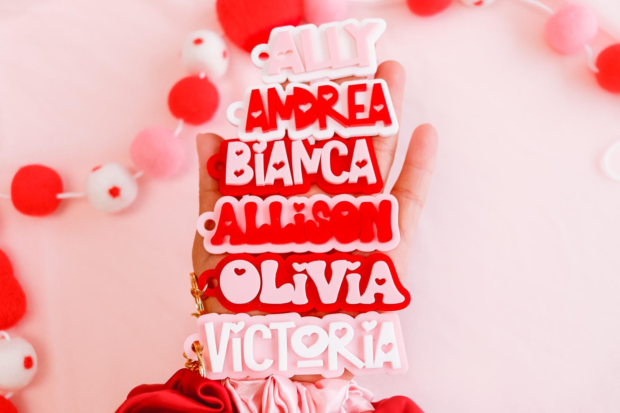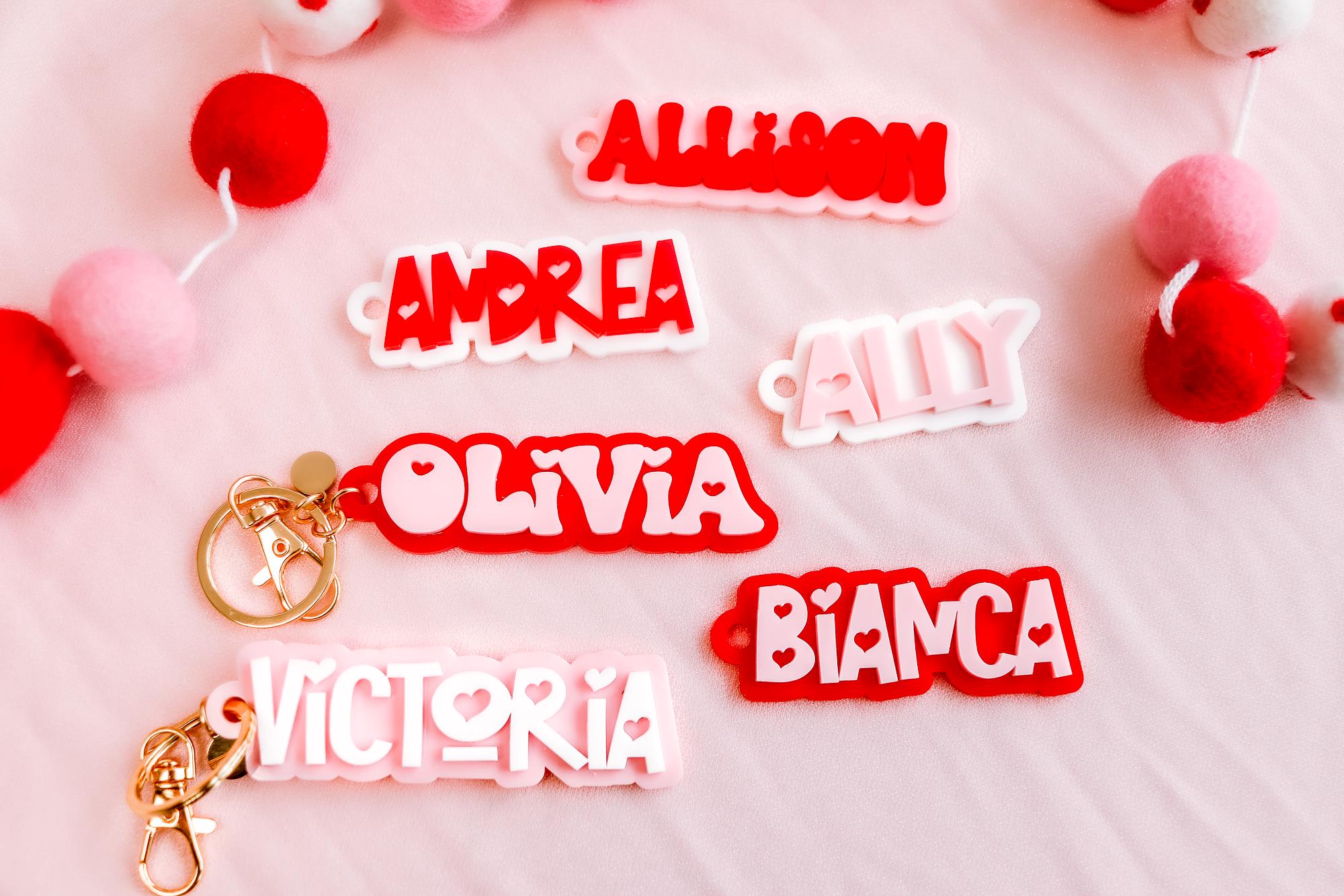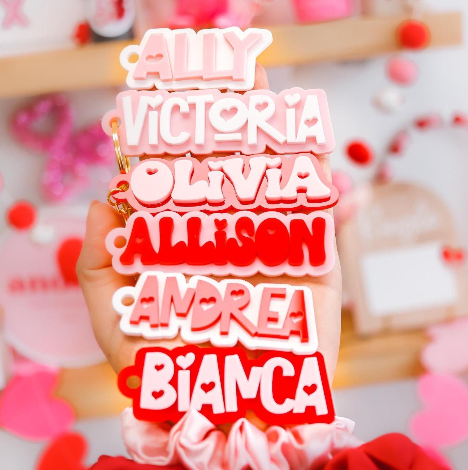Celebrate love with these adorable Valentine's custom name keychains! 💖 Perfect for gifting or personal use, these keychains add a pop of charm and personalization to your everyday essentials. Crafted with vibrant acrylic, each keychain is designed with a bold, playful font and delightful heart accents to capture the Valentine's spirit.
