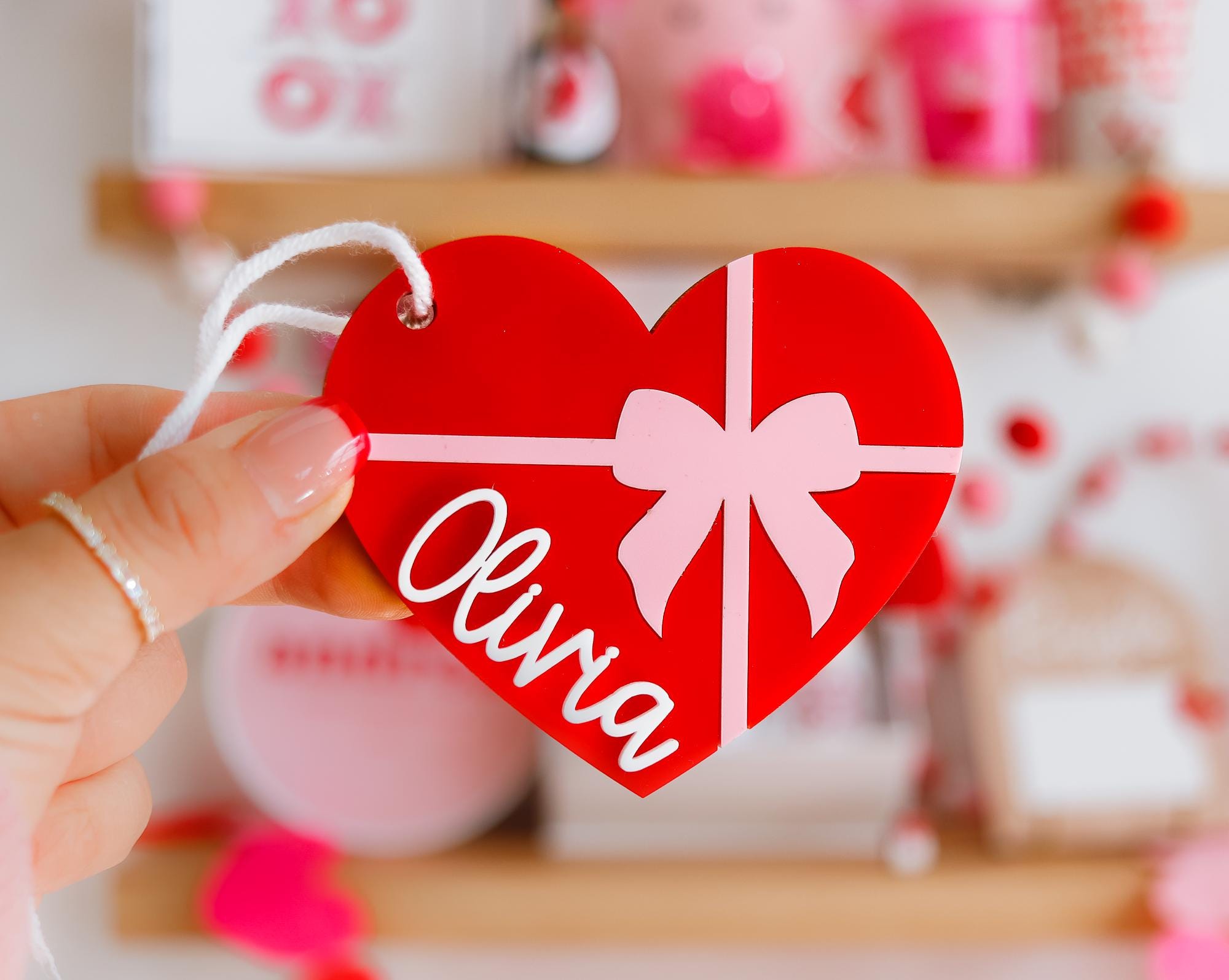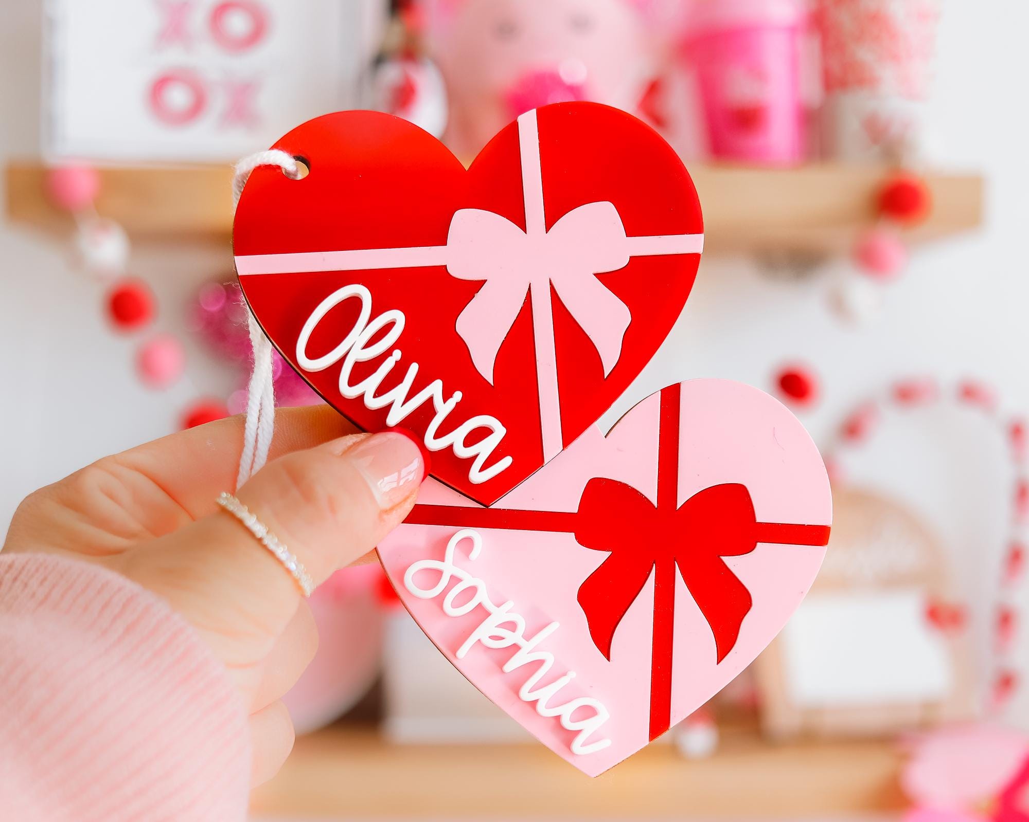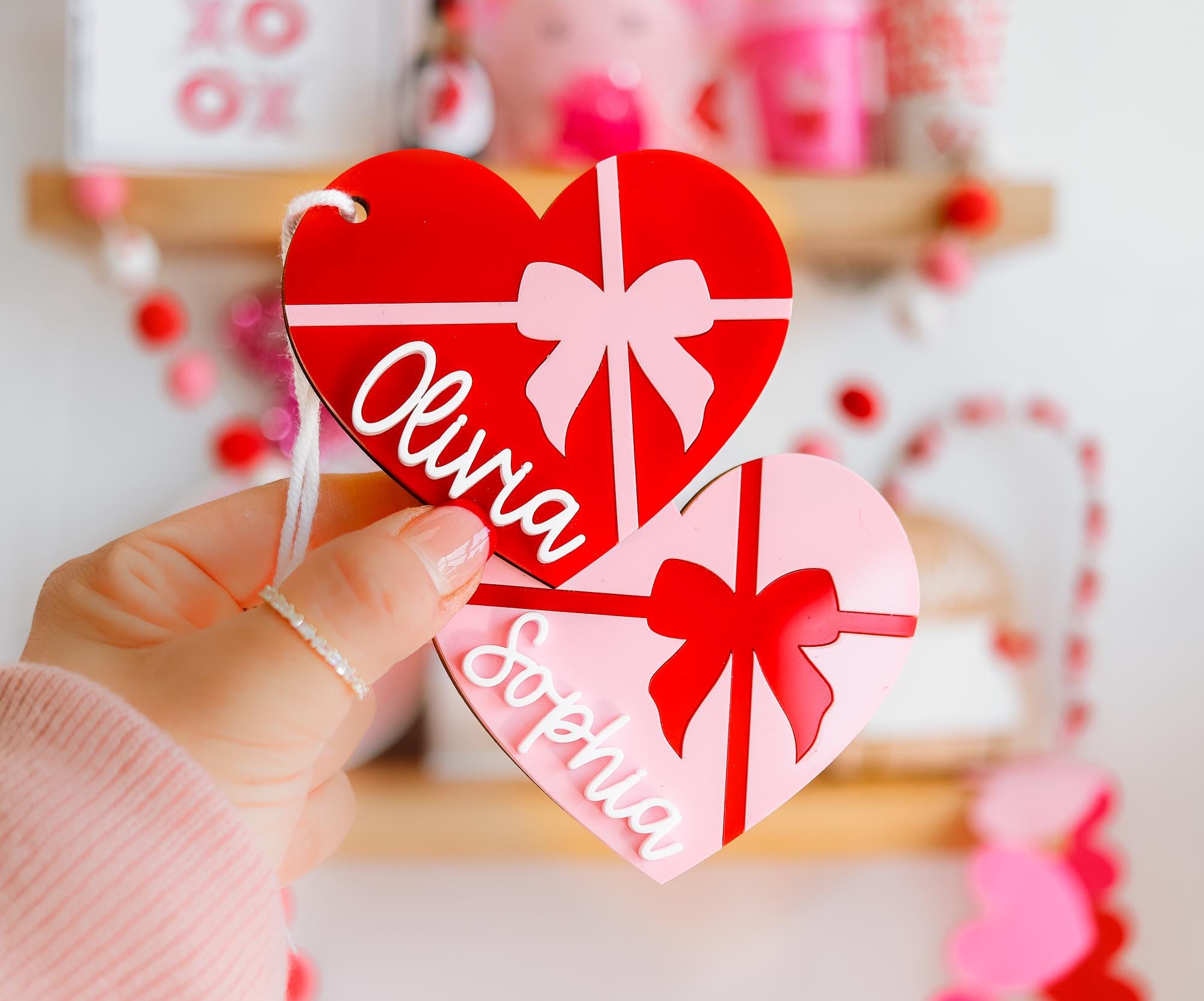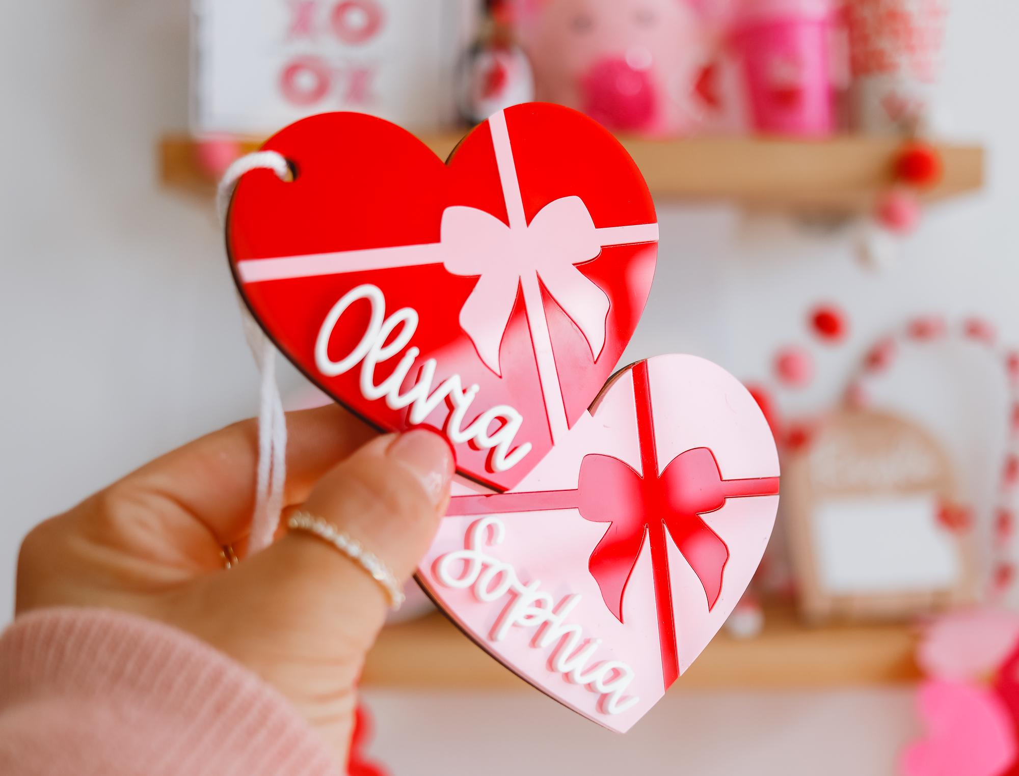 Celebrate Valentine’s Day with these stunning heart-shaped name tags! 💕 Perfect for love baskets, Valentine’s party favors, or personalized gifts, each tag is crafted from high-quality acrylic with a vibrant bow design. Customizable with your chosen name, these tags are ideal for backpacks, gift toppers, or as a sweet keepsake. Lightweight and durable, they add a thoughtful and festive touch to any Valentine’s celebration! 🎀