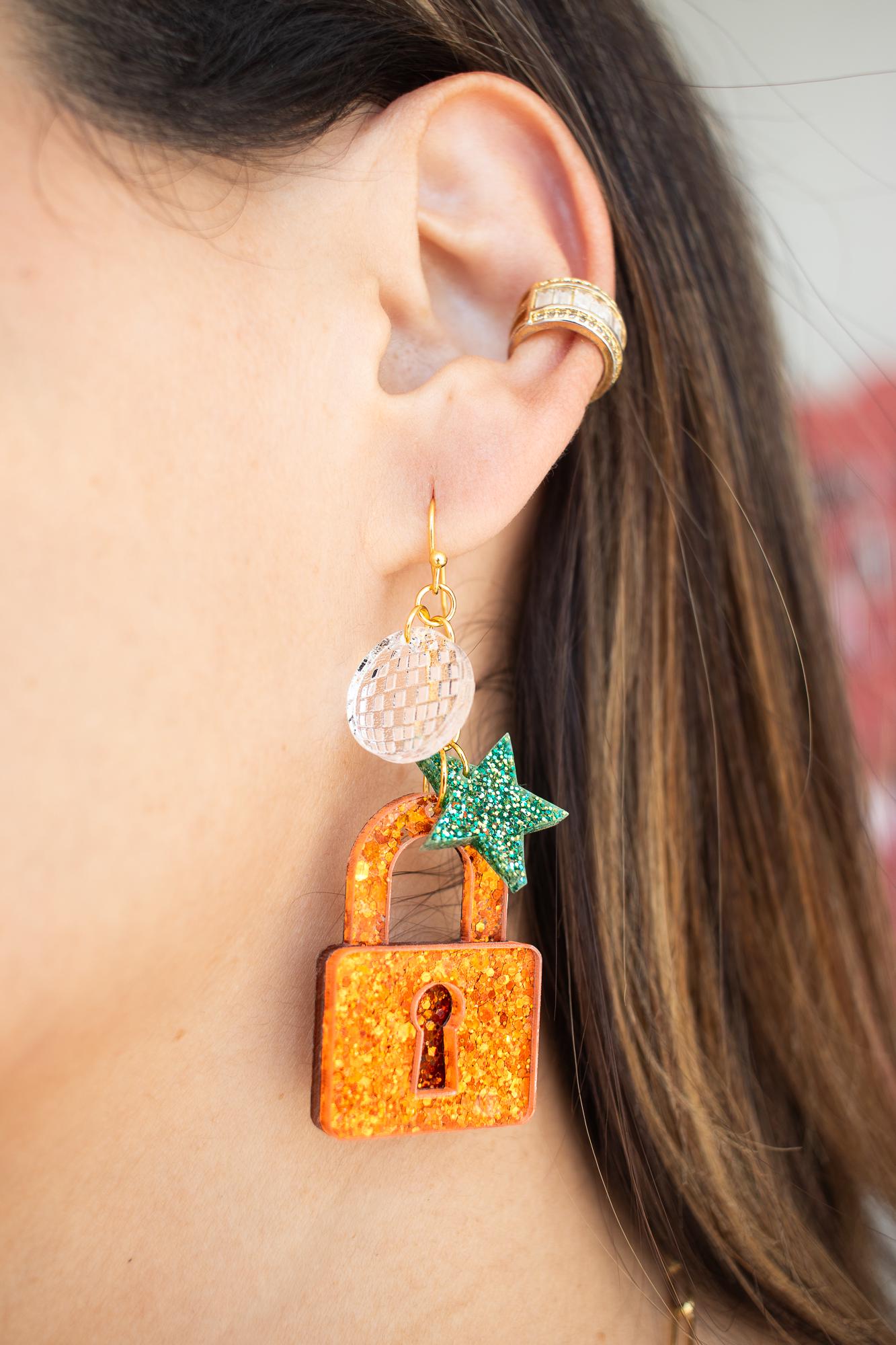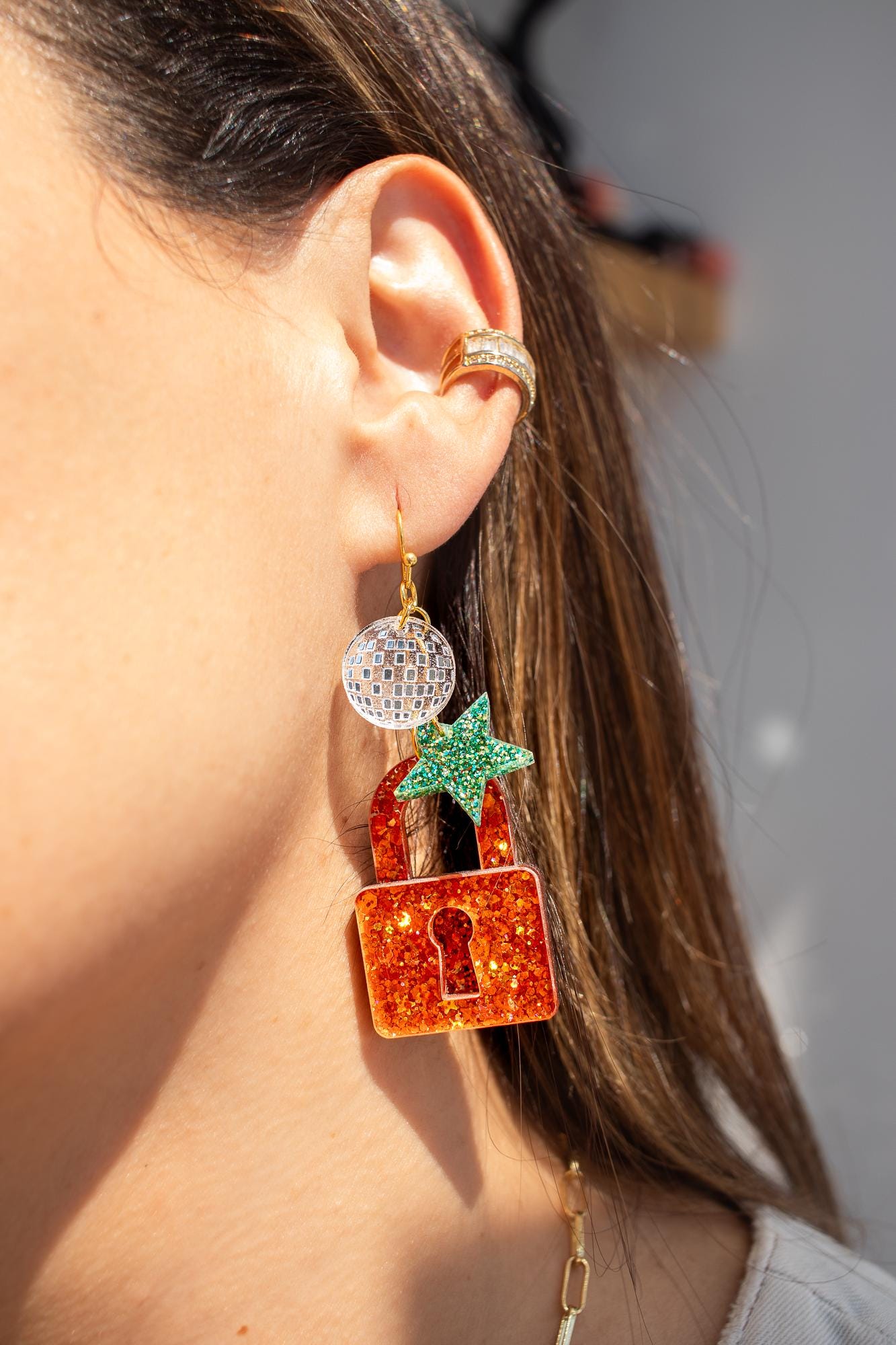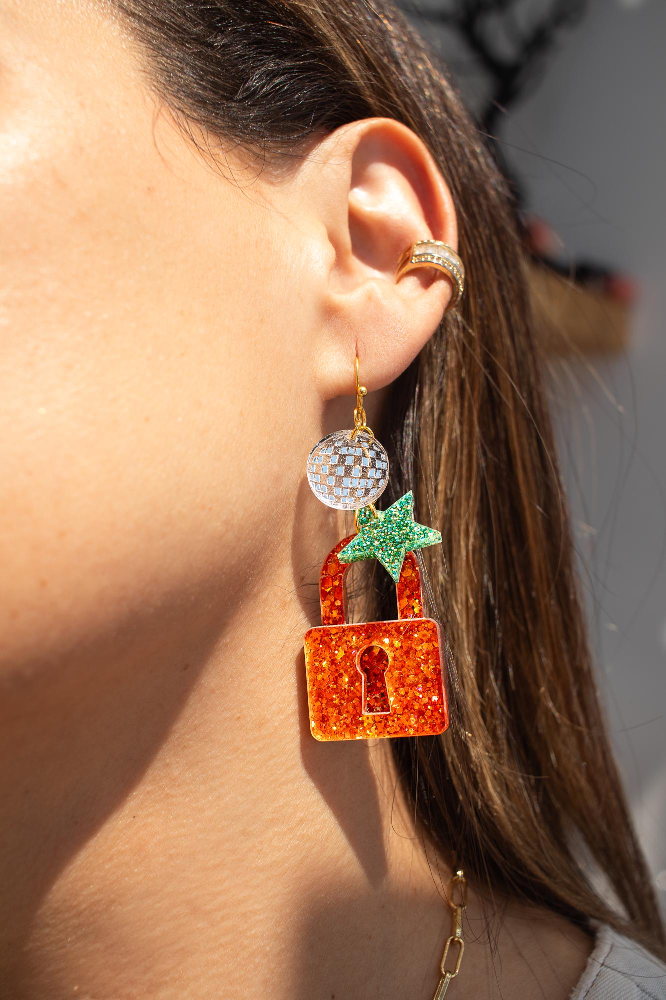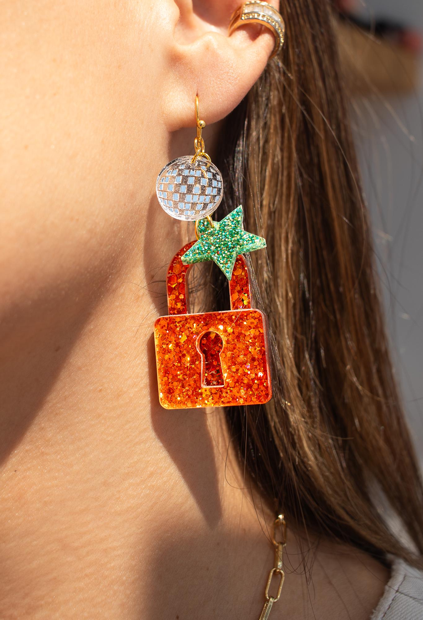 Sparkle, shine, and lock in the glam! These bold statement earrings feature a silver disco ball charm, a glittering green star, and a vibrant orange padlock drop — the ultimate playful nod to showgirl style. Designed to stand out, these earrings are lightweight, fun, and full of personality.