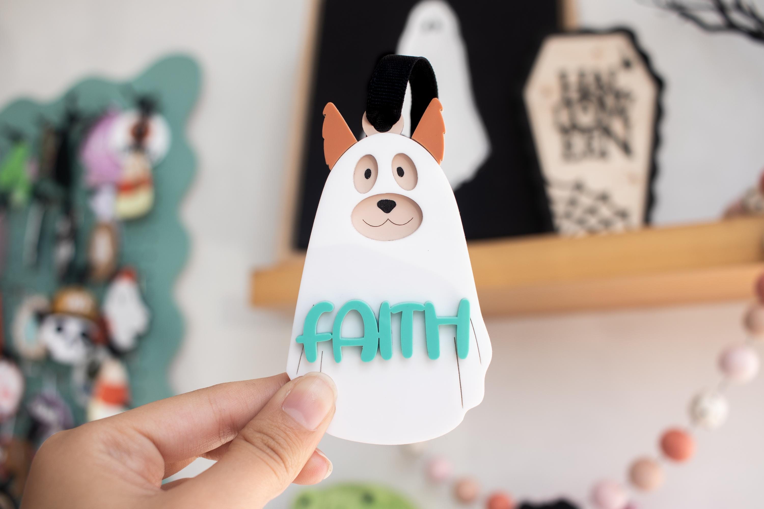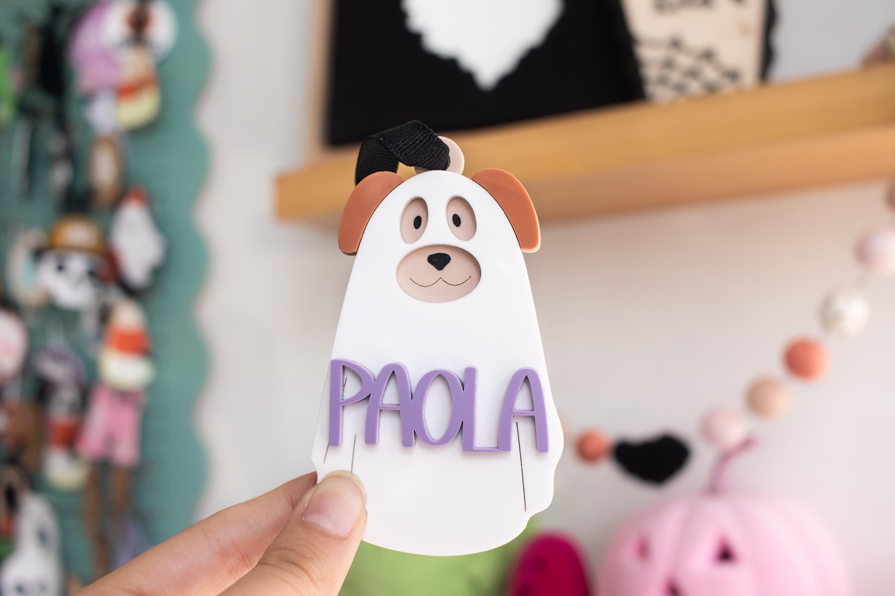 Add a playful and spooky touch to your Halloween with this adorable Dog Ghost Tag, personalized with the name of your choice! Perfect as a festive ornament, gift tag, basket label, or even a cute addition to your trick-or-treat bags.
