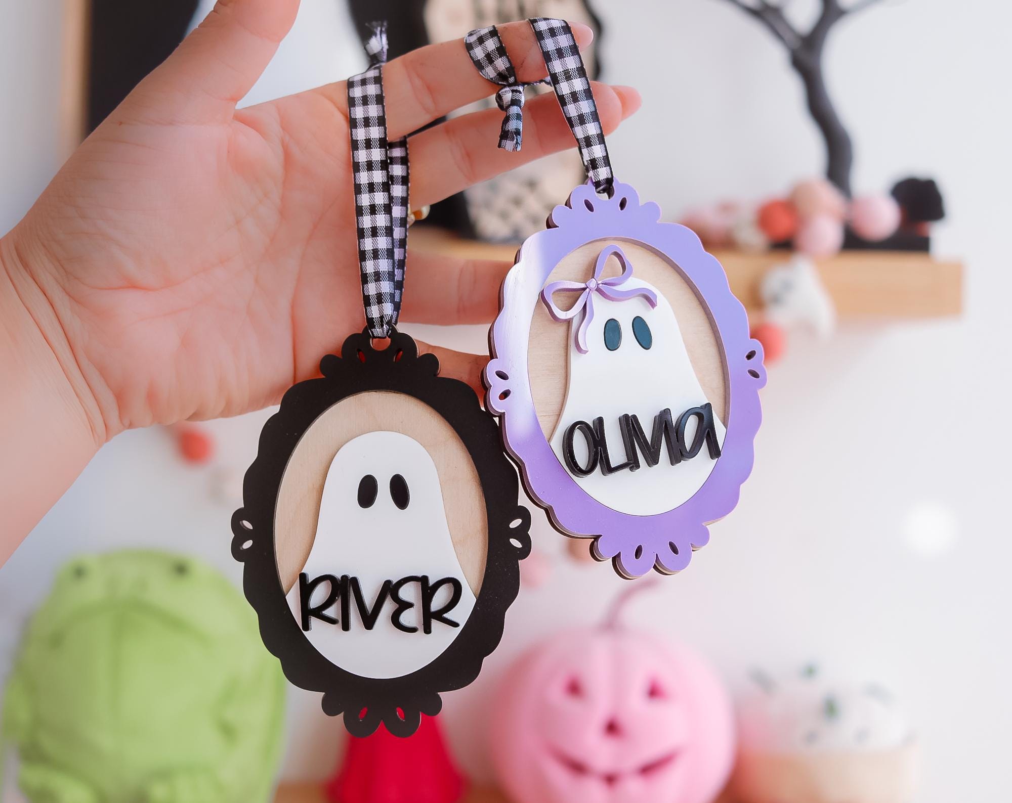 Personalized Ghost Name Tag for Halloween Basket | Custom Frame Color | Halloween Gift Tag | Trick or Treat Basket Tag | Cute Ghost Ornament