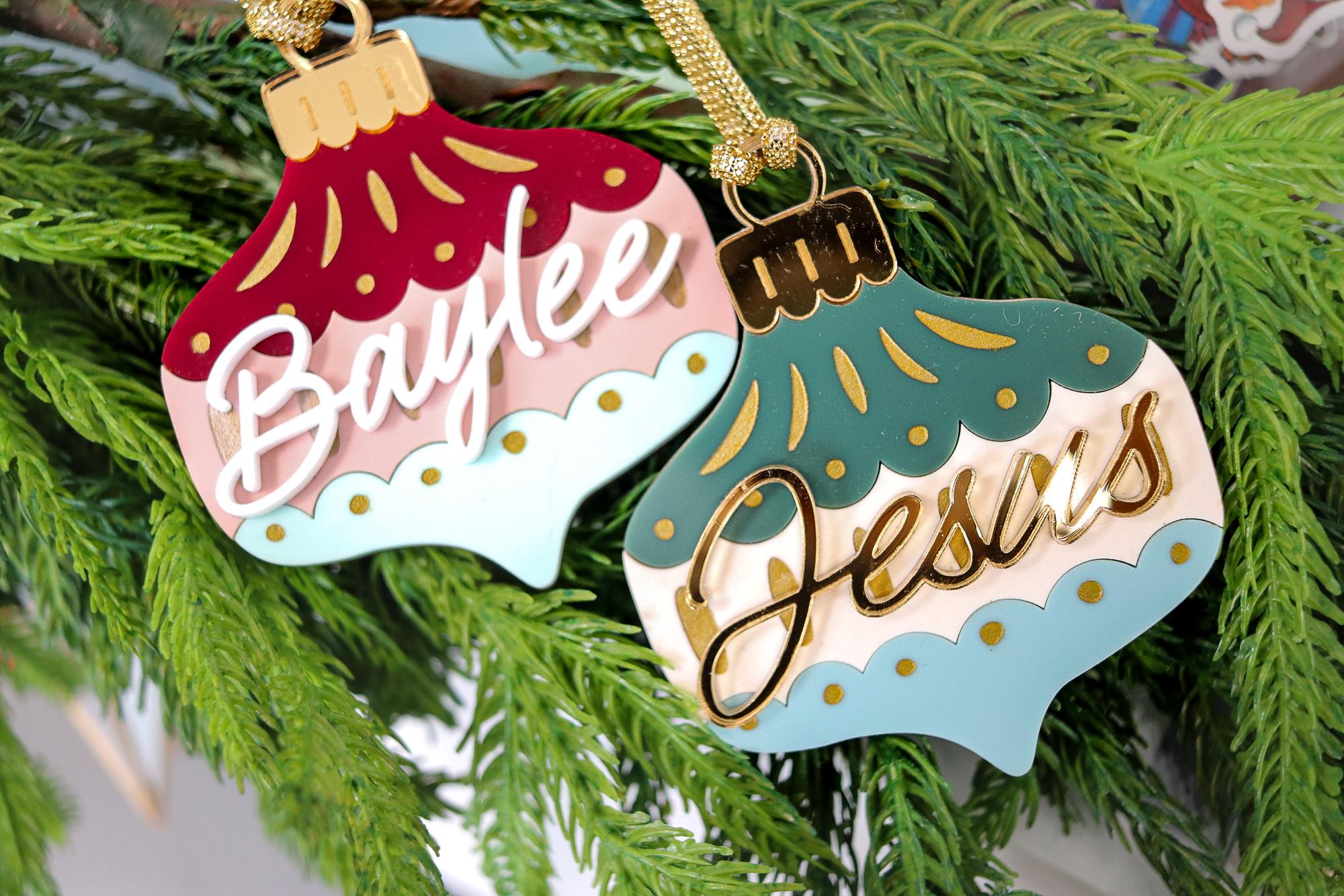 Each ornament is laser-cut & layered with a unique retro look, featuring scalloped detailing, gold accents, and your choice of font color. Lightweight but durable a keepsake to cherish year after year!