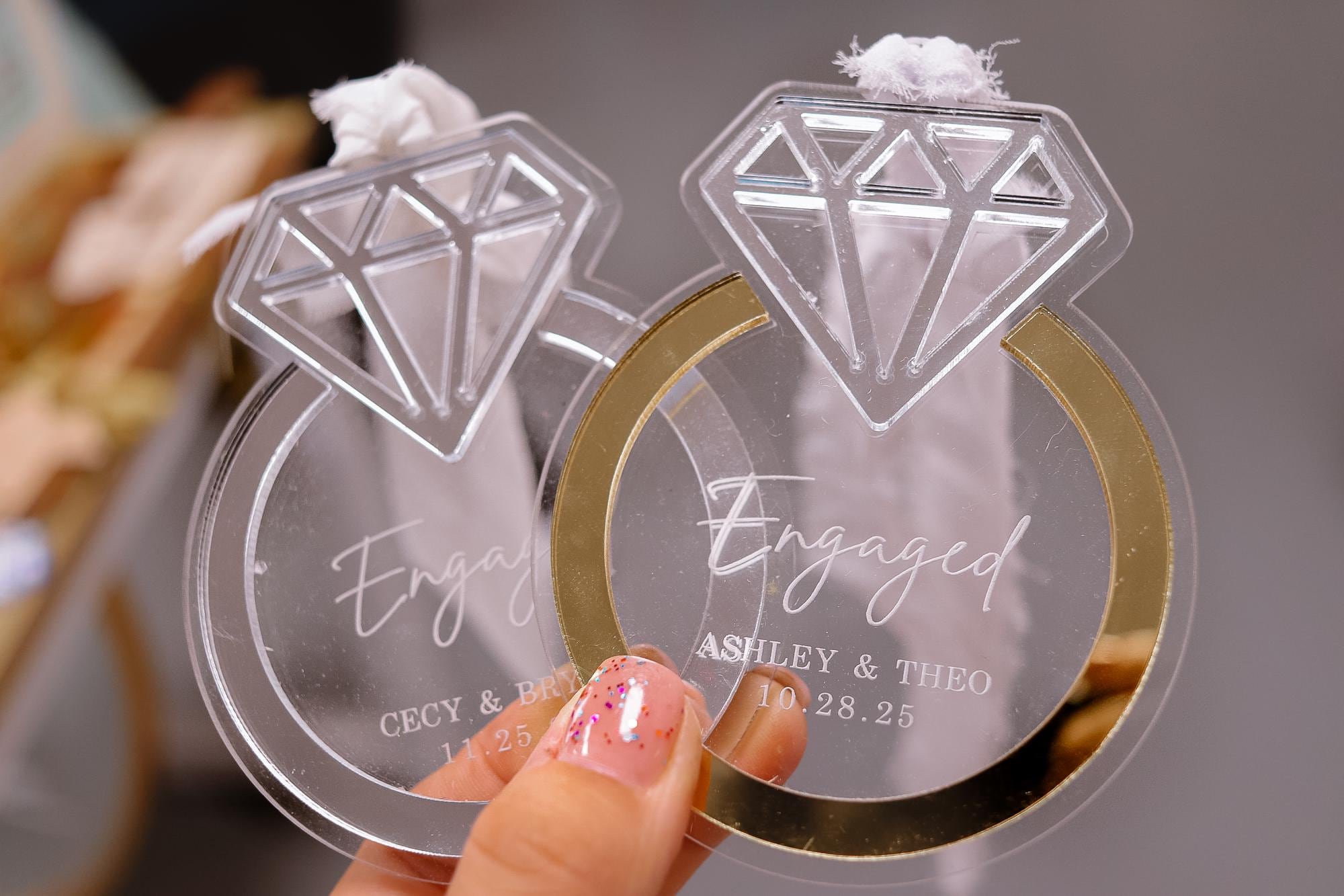 Commemorate the special moment of saying "Yes!" with this stunning engagement ornament, crafted in the shape of an elegant diamond ring. This personalized ornament is the perfect keepsake for couples celebrating their engagement or first Christmas together. With options in gold, silver, rose gold, black, and copper, you can choose the finish that best fits your style or holiday decor. Engraved with the couple’s names and engagement date, this ornament makes a beautiful addition to any tree, reminding you of a love that sparkles just as brightly.