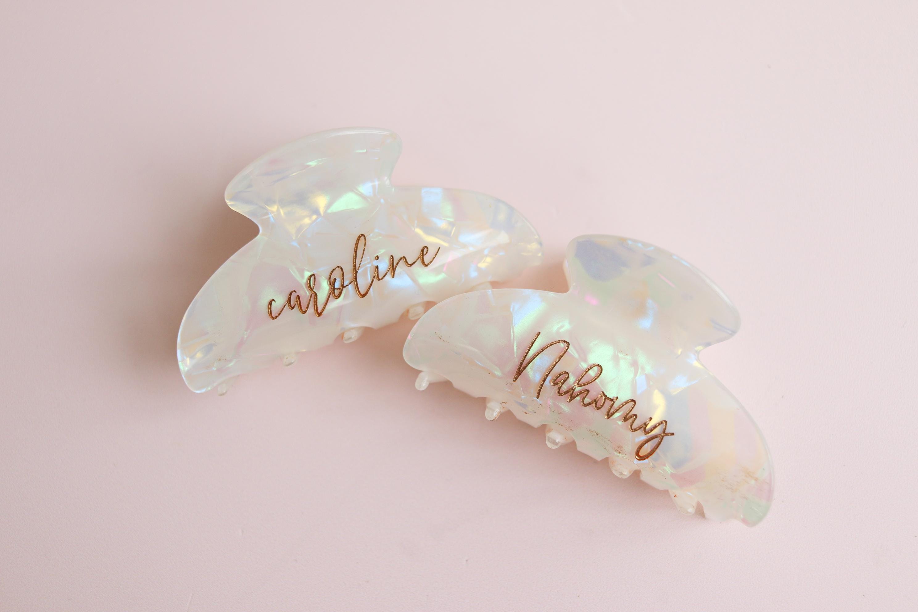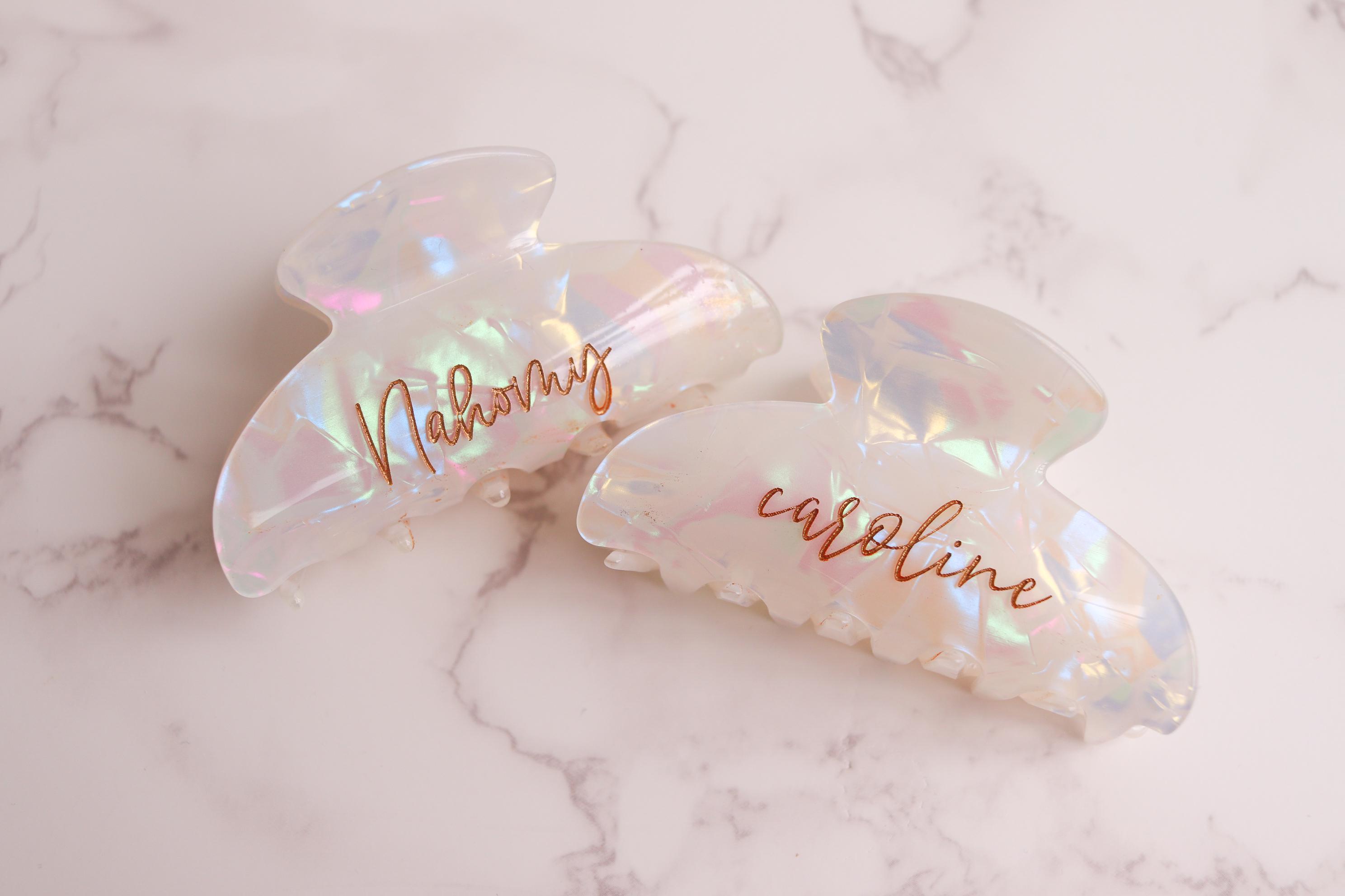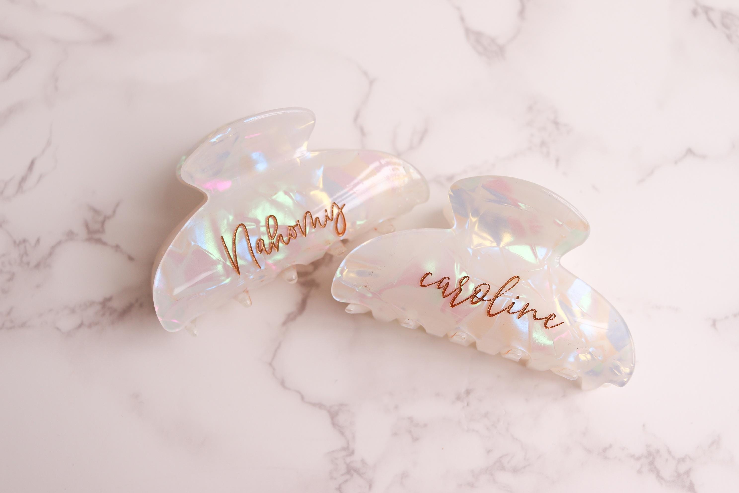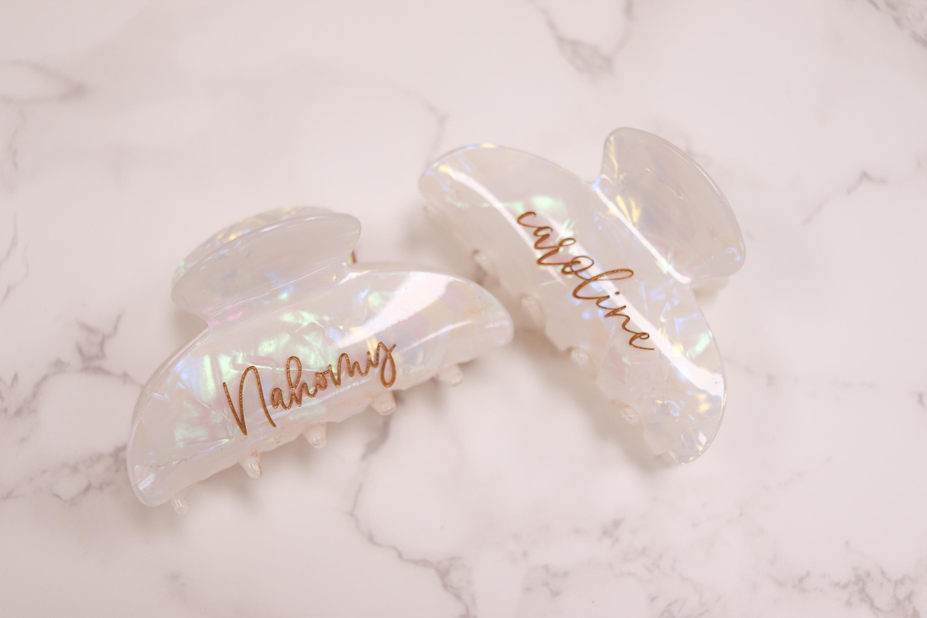 Elevate your daily hair routine with this elegant personalized claw clip. Crafted from a pearlescent, iridescent acrylic and engraved with your custom name or word, this clip combines beauty, function, and a meaningful personal touch. Finished with hand-painted gold lettering, it’s the perfect blend of minimal and luxe.