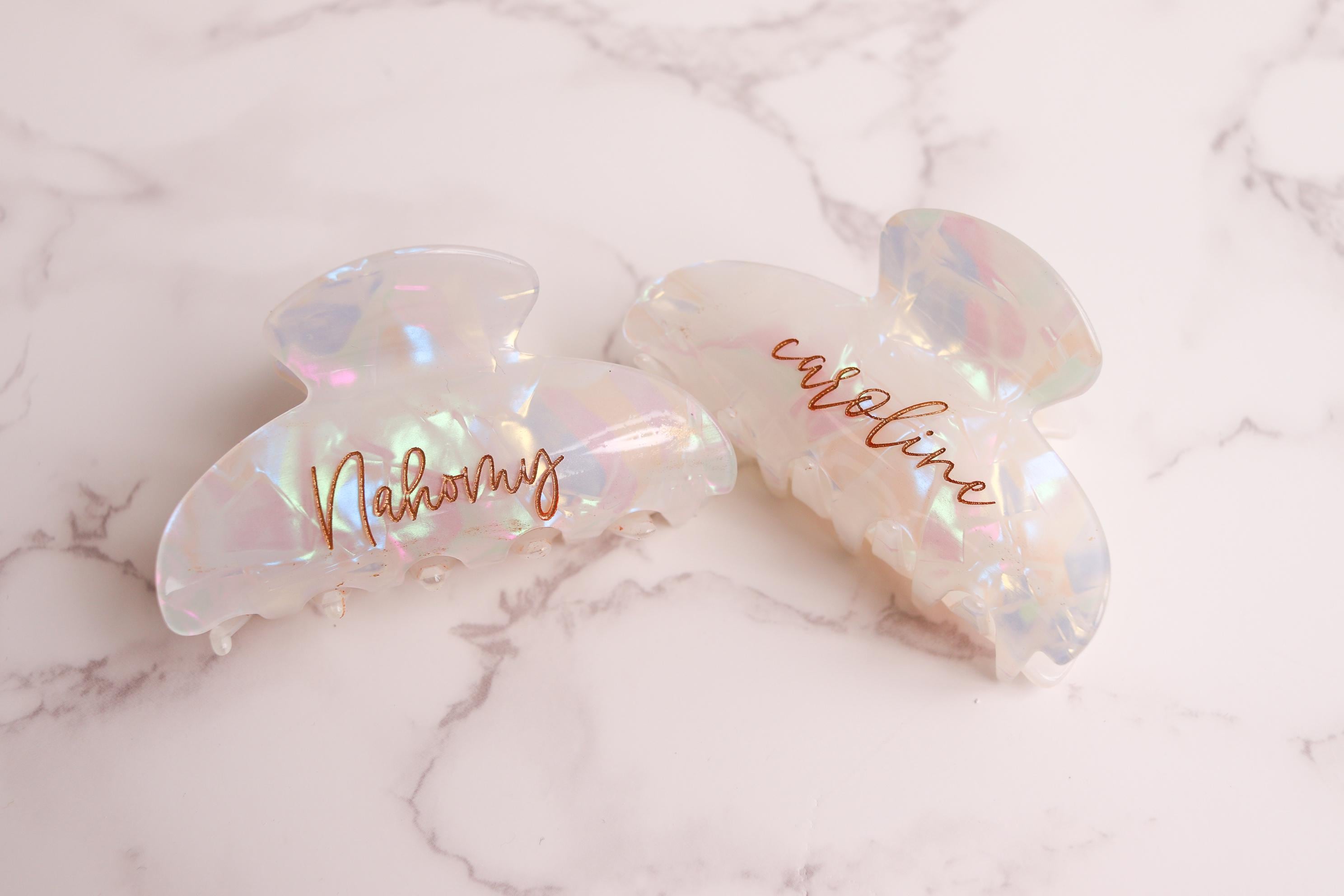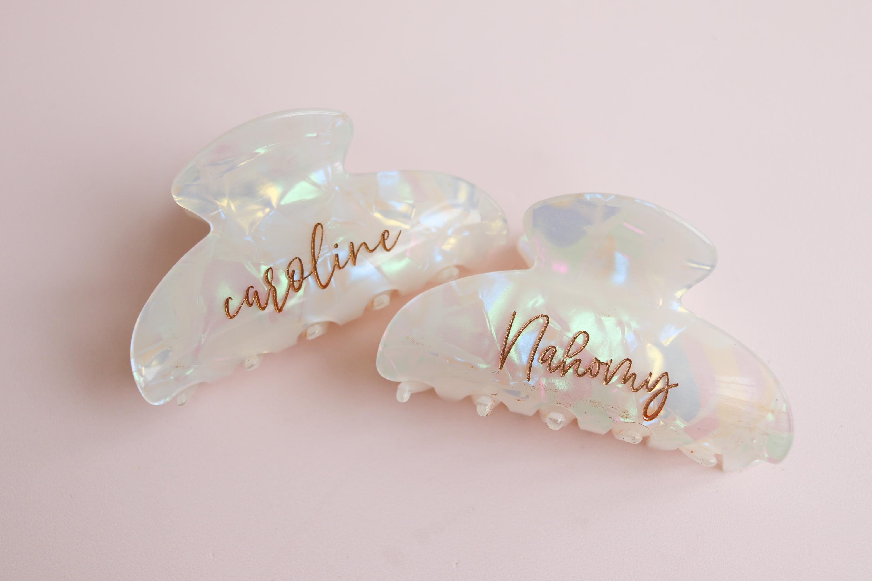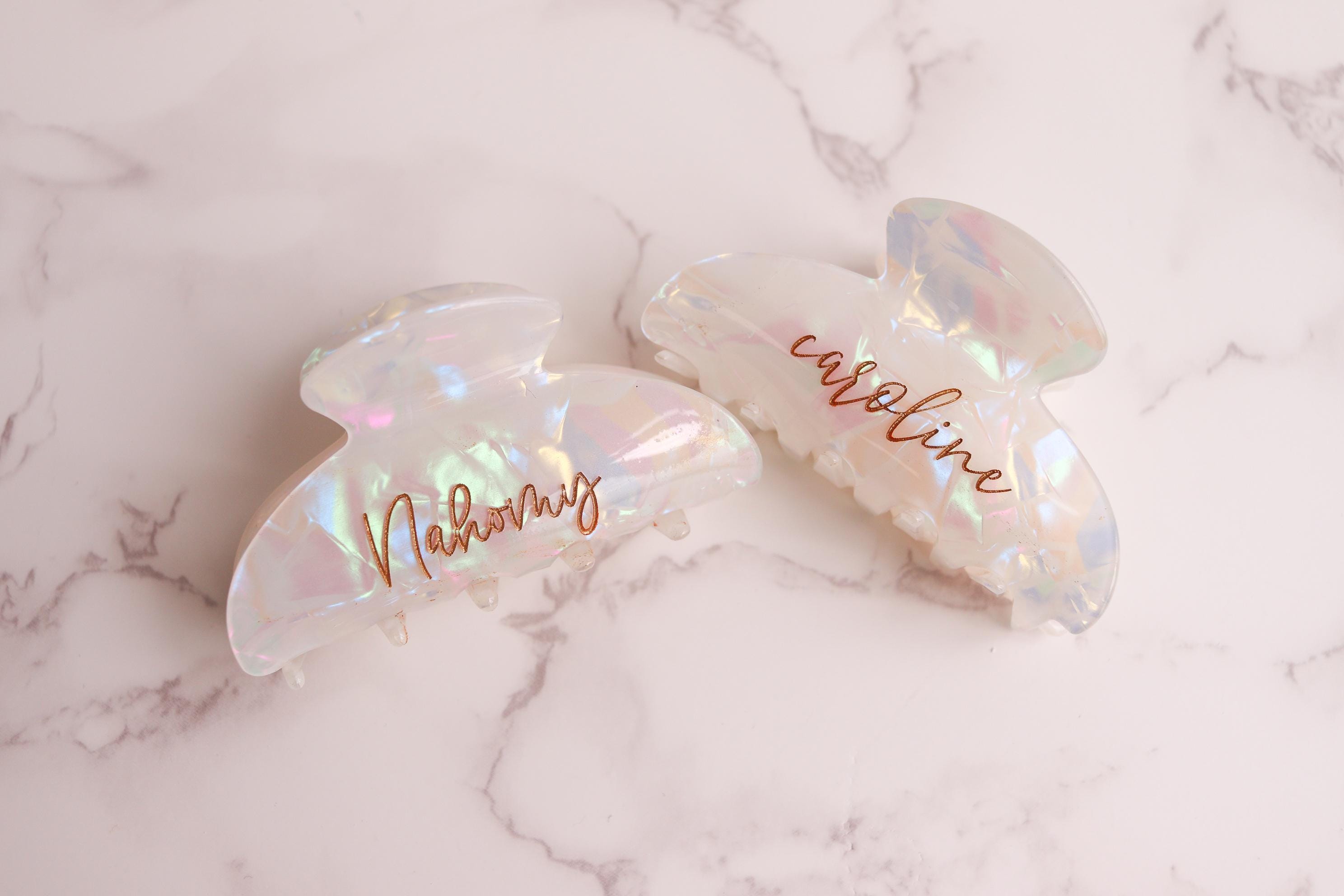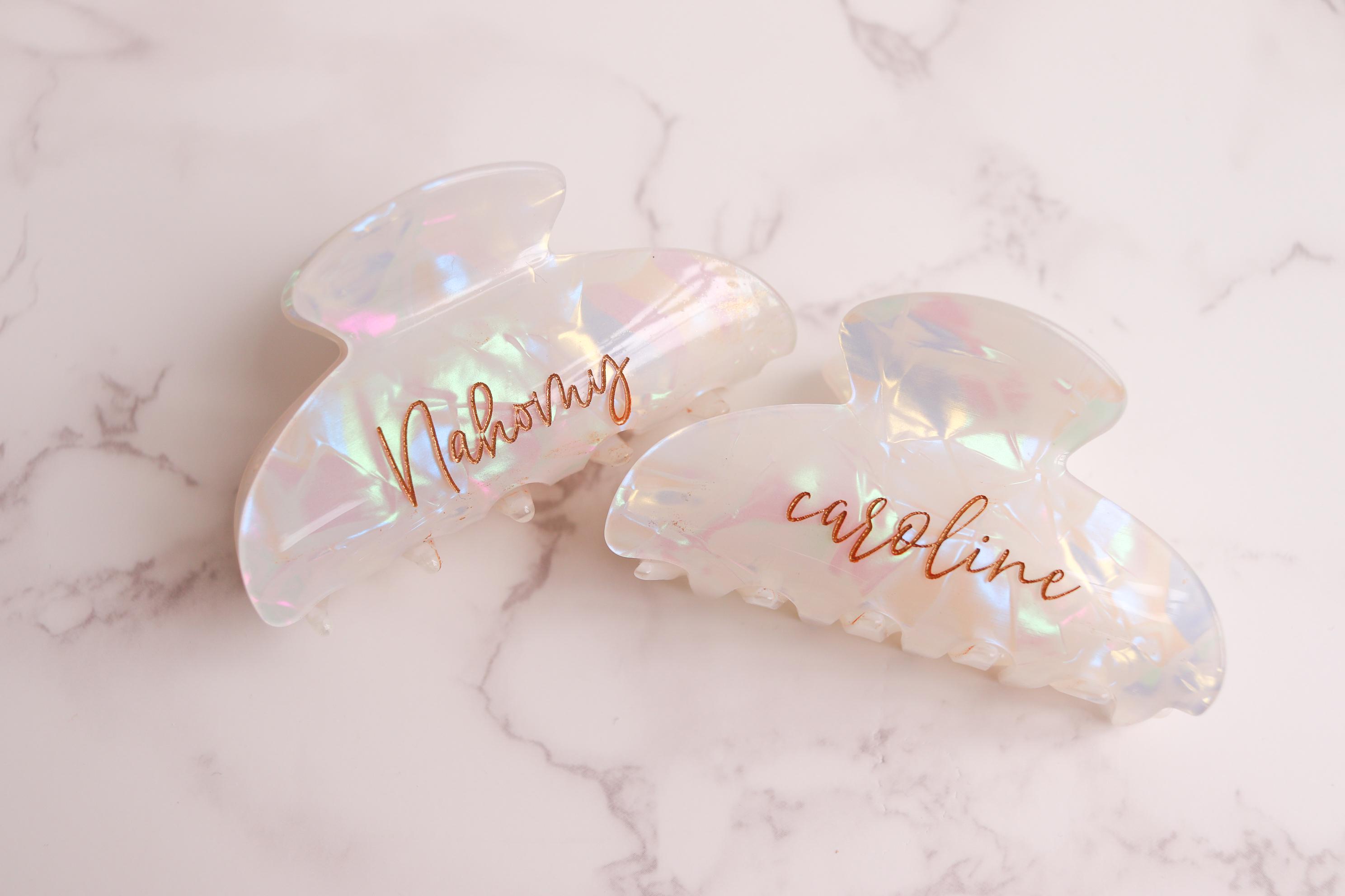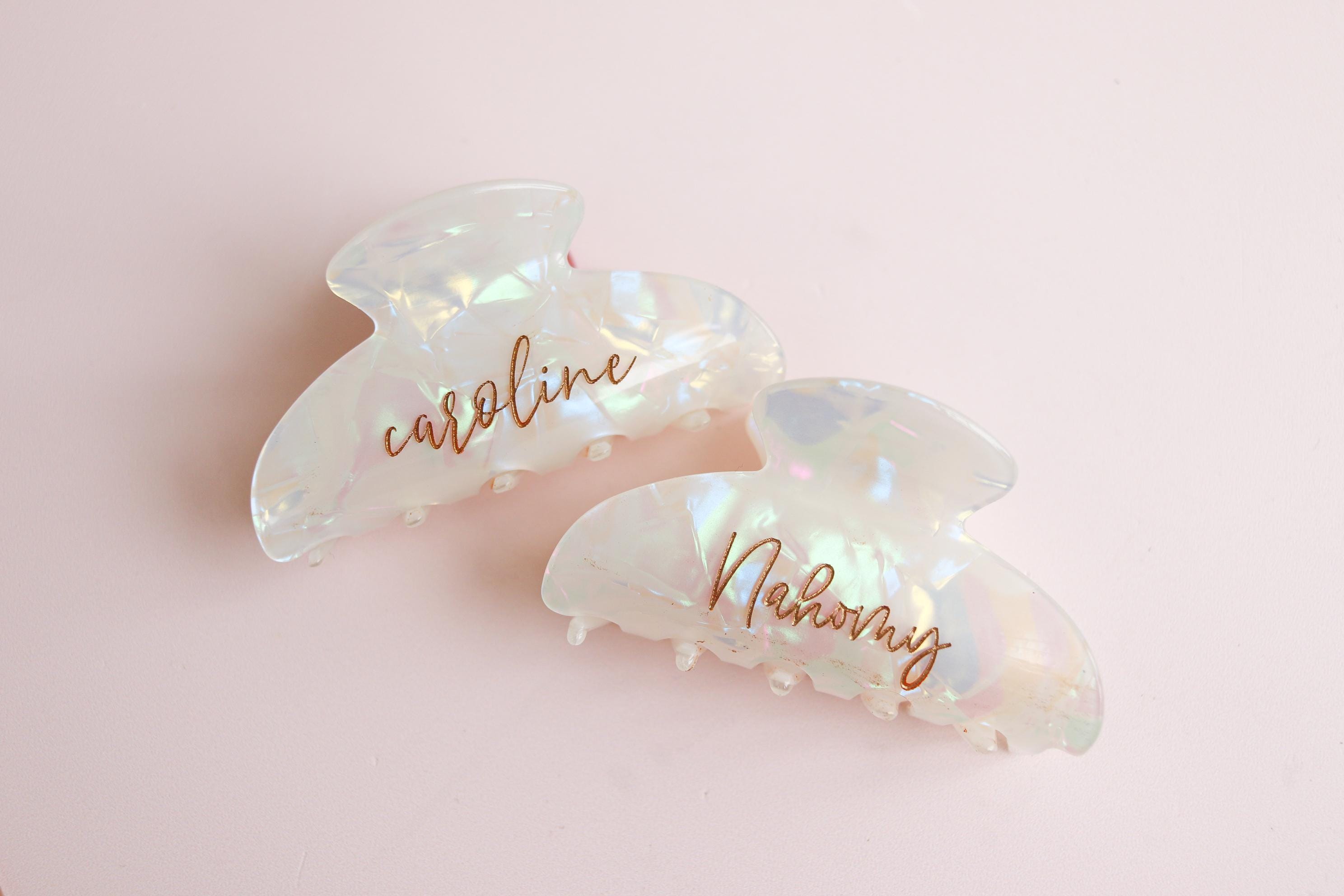 Elevate your daily hair routine with this elegant personalized claw clip. Crafted from a pearlescent, iridescent acrylic and engraved with your custom name or word, this clip combines beauty, function, and a meaningful personal touch. Finished with hand-painted gold lettering, it’s the perfect blend of minimal and luxe.
