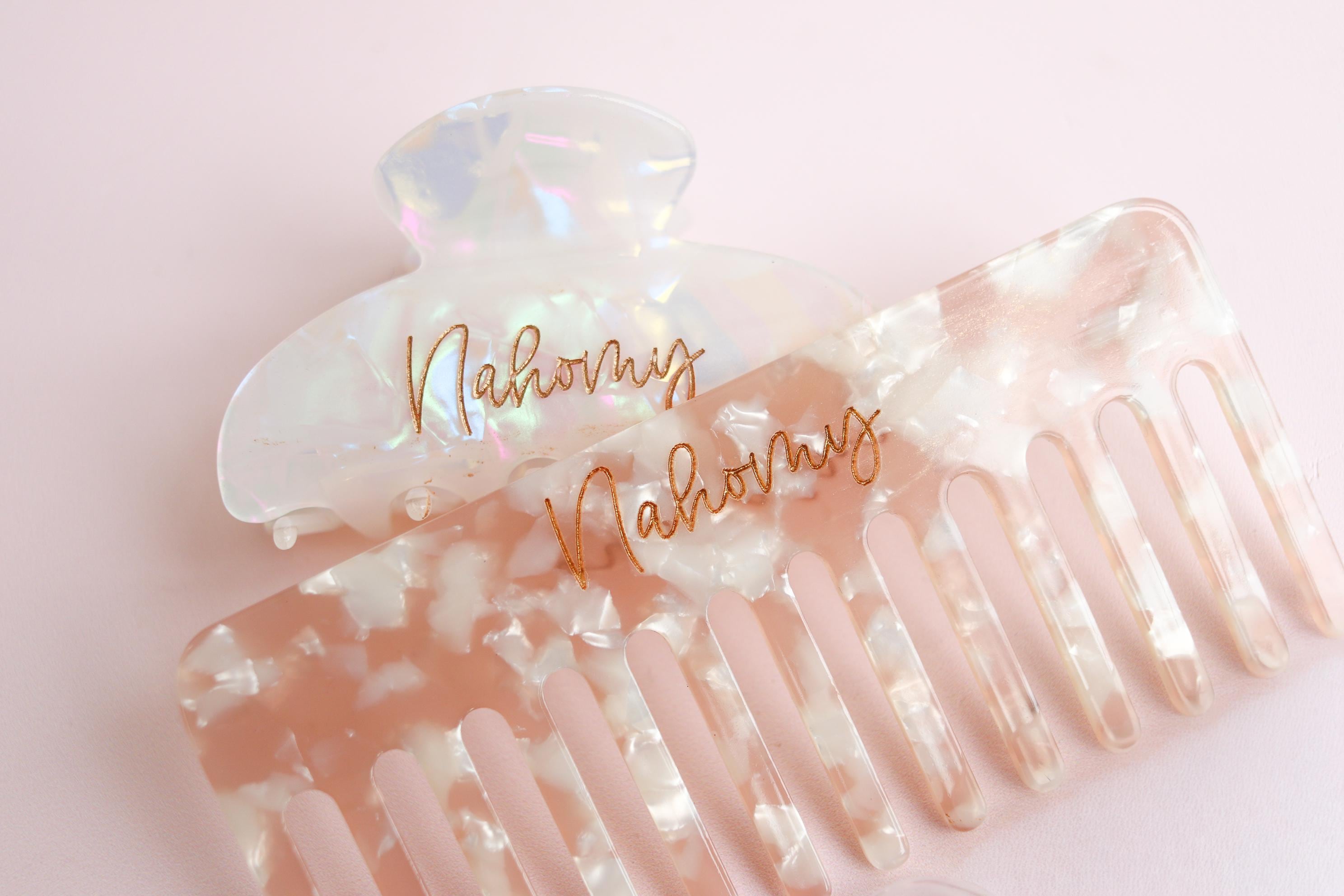 This fan-shaped comb and coordinating claw clip set features soft neutral tones, modern lines, and meaningful personalization. Each piece is custom engraved with your name or short text and carefully hand-finished in gold or silver lettering for a refined, timeless look.