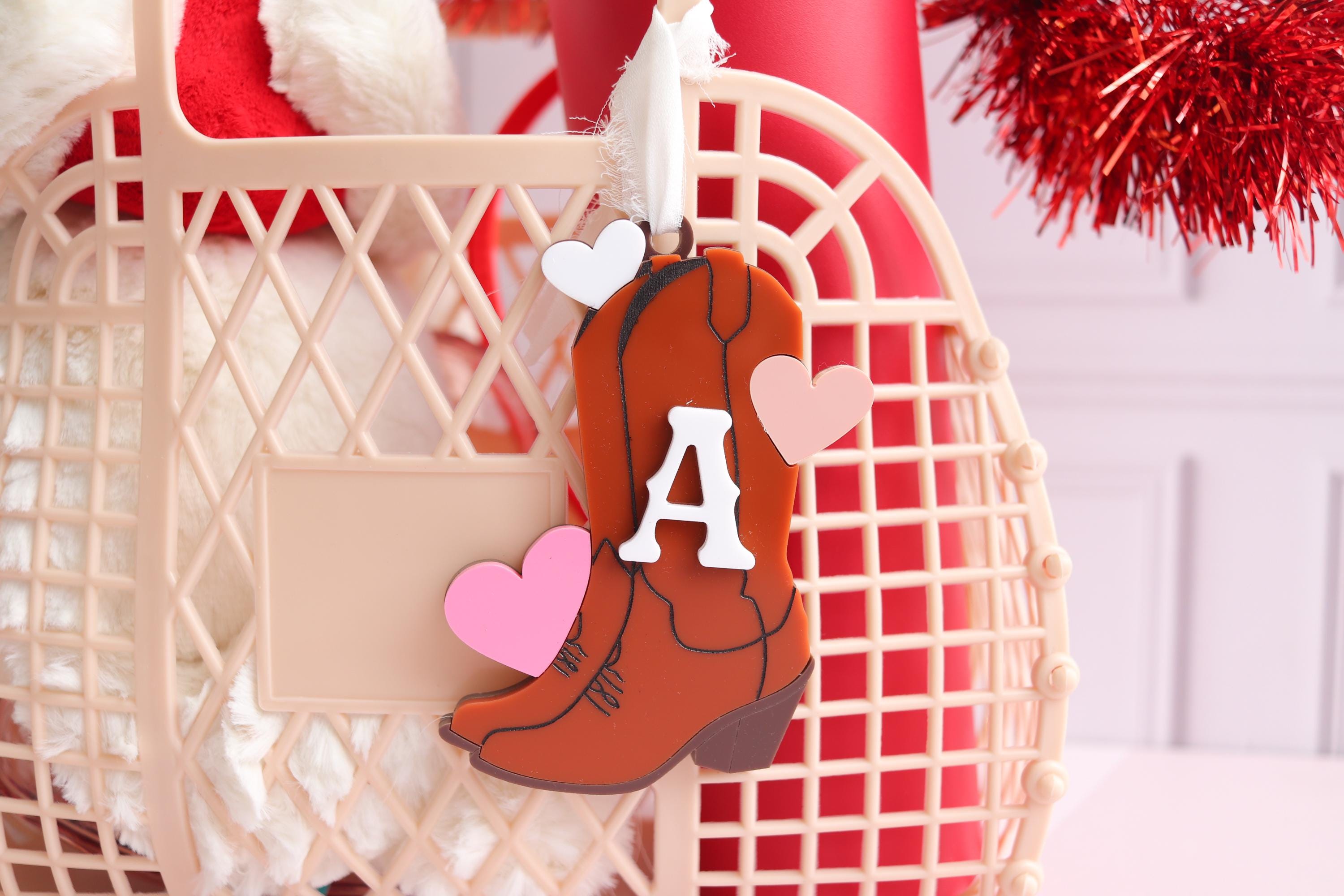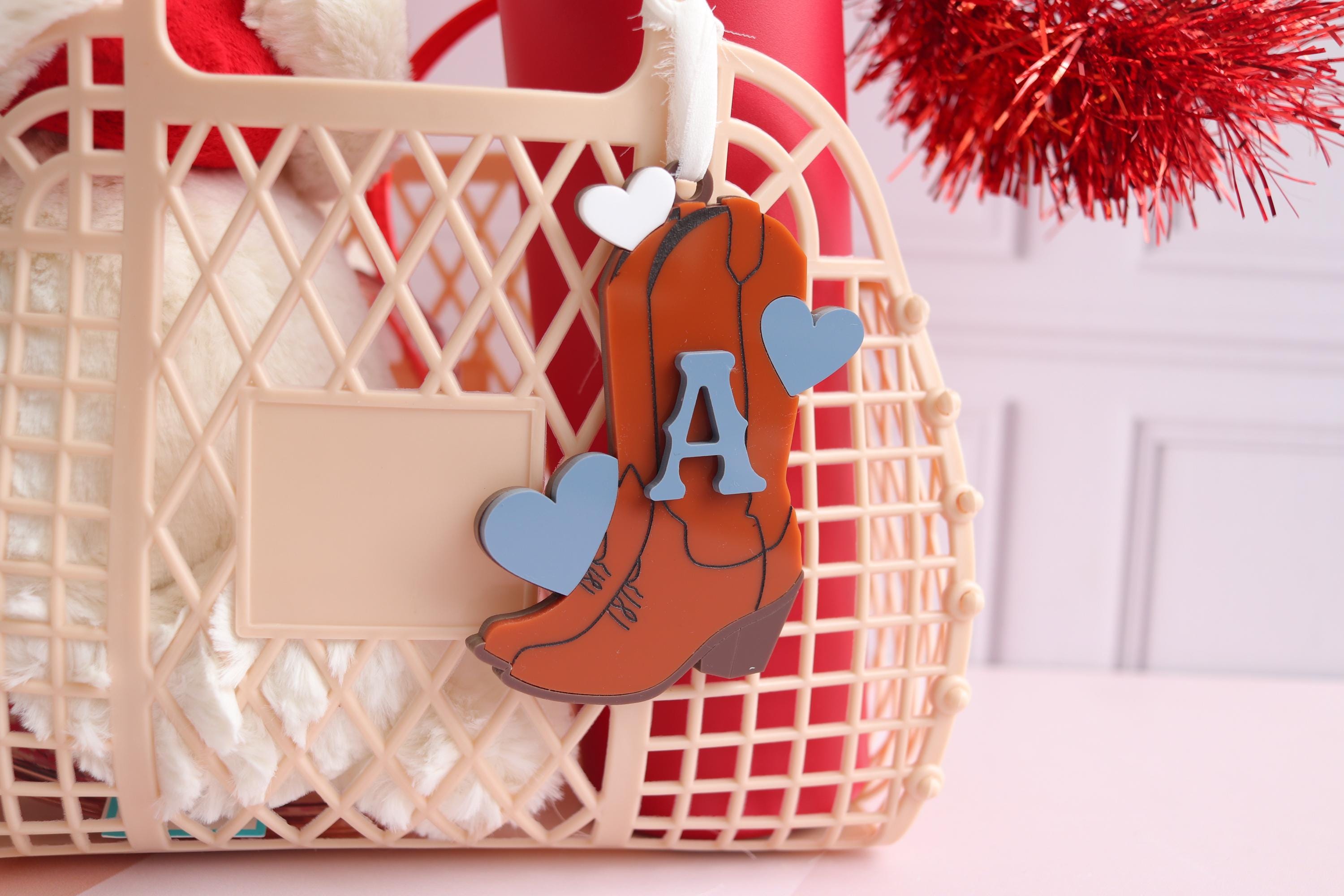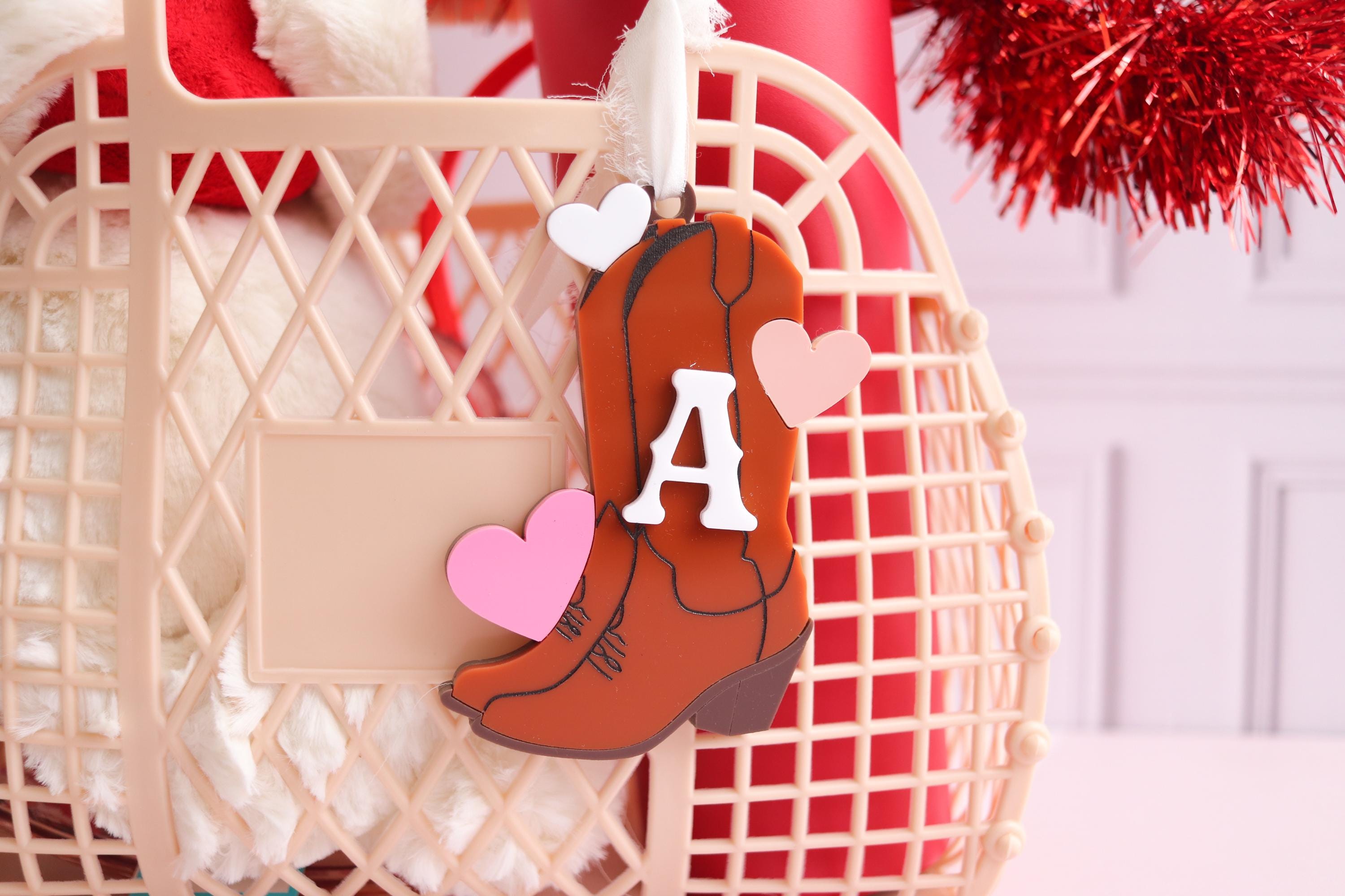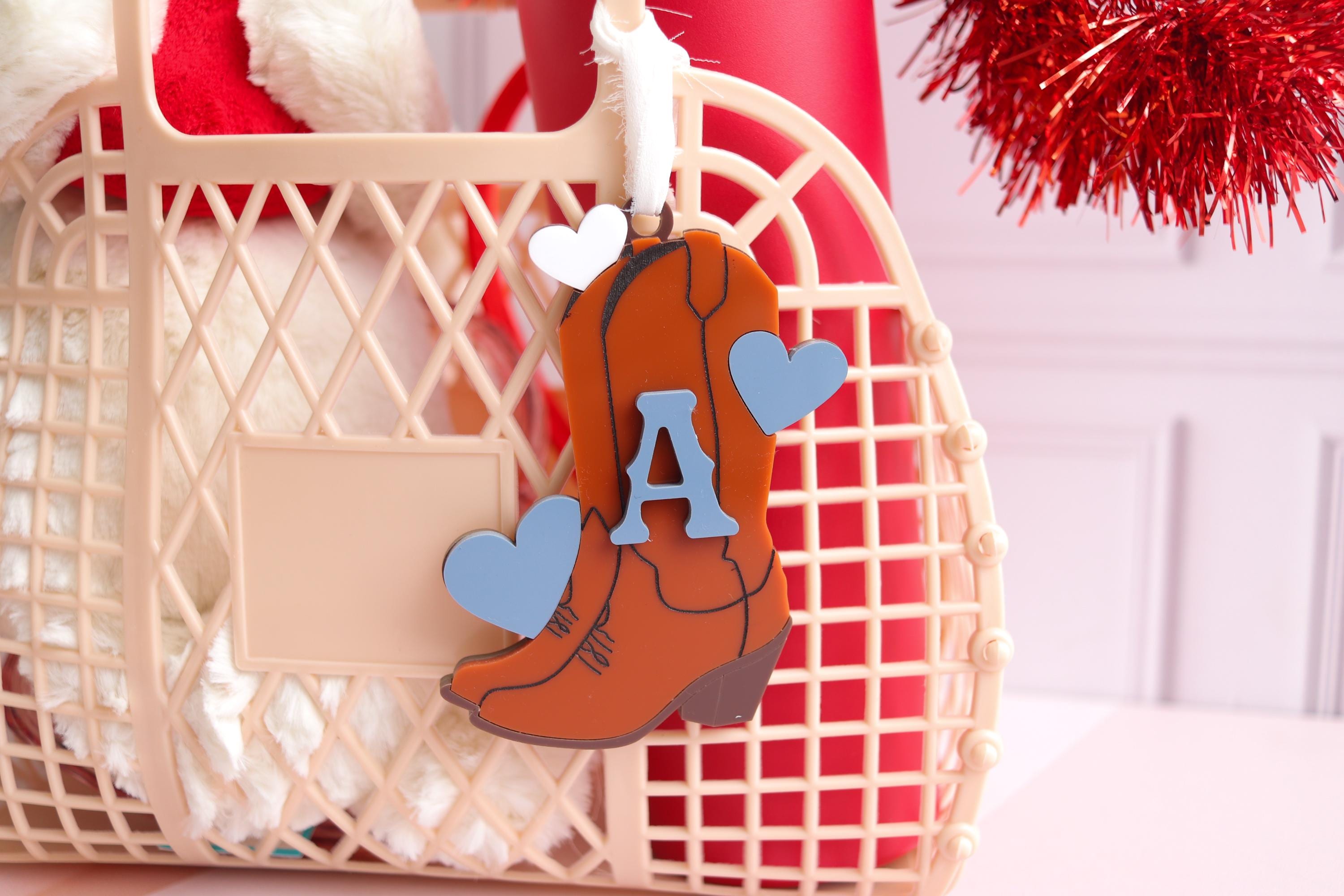 Add the sweetest personalized touch with this name tag! Designed with a soft Cowgirl Boot and raised Initial lettering, this custom tag is fully customizable so you can choose the hearts color and the font color to match your style or gift theme perfectly.