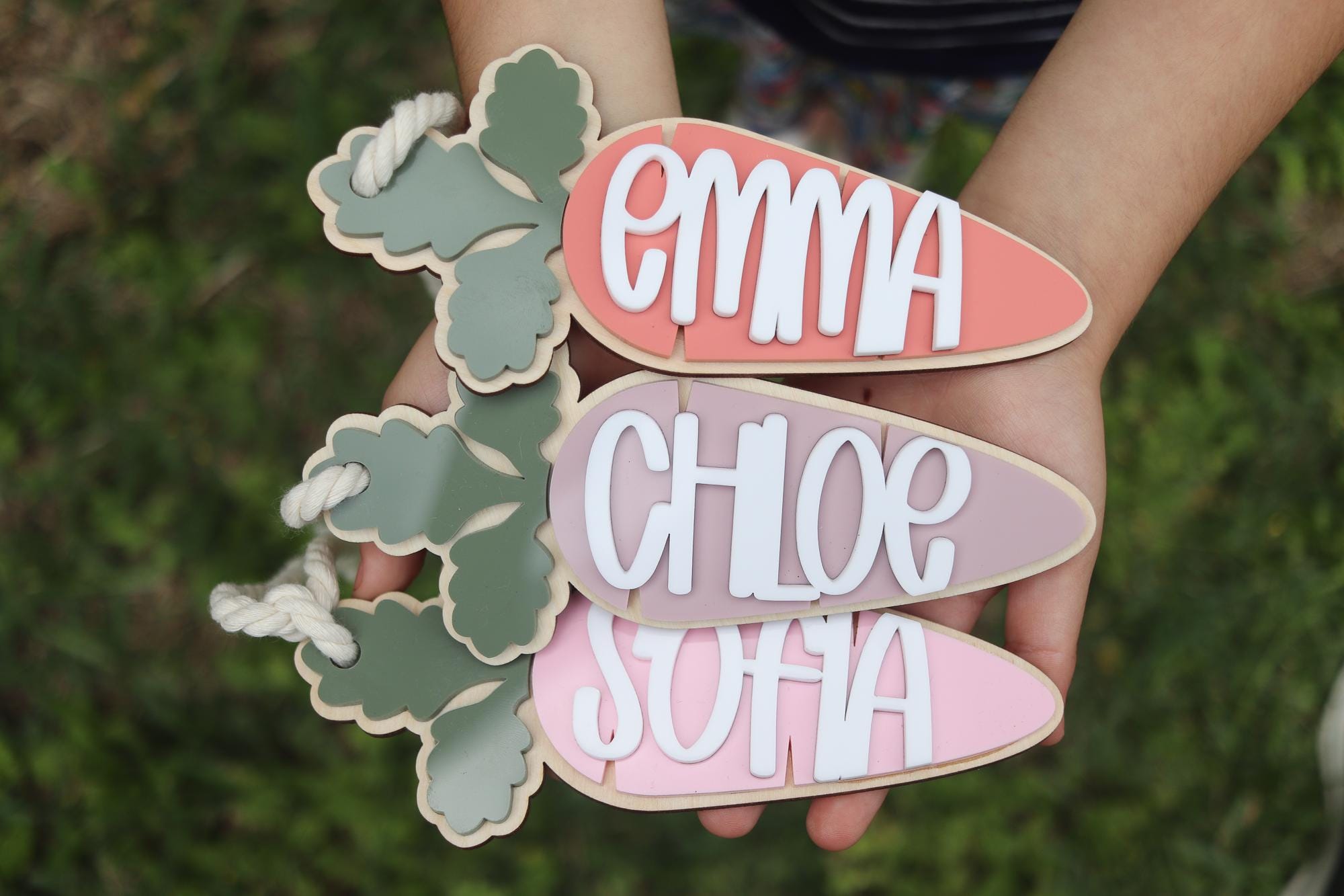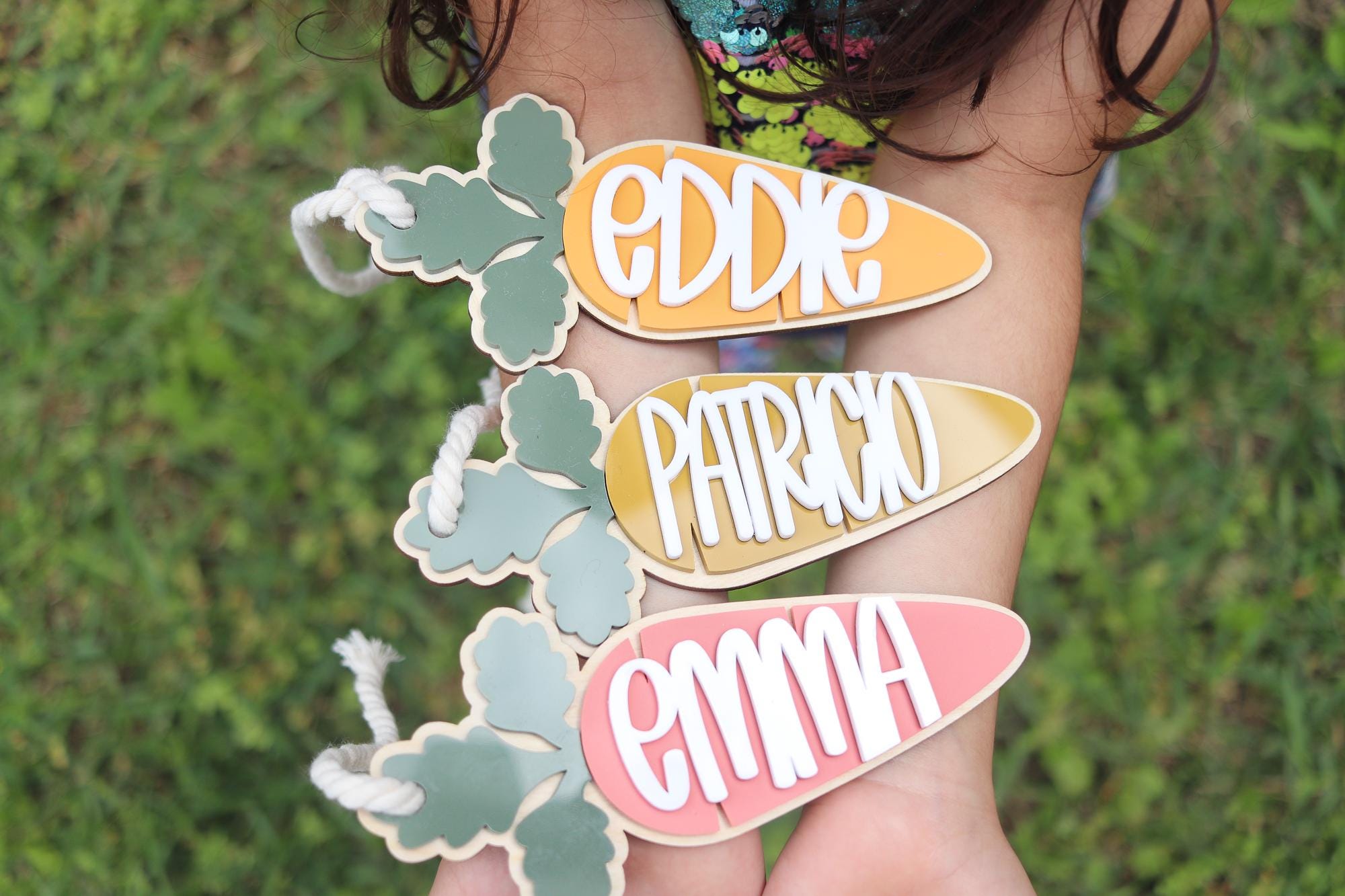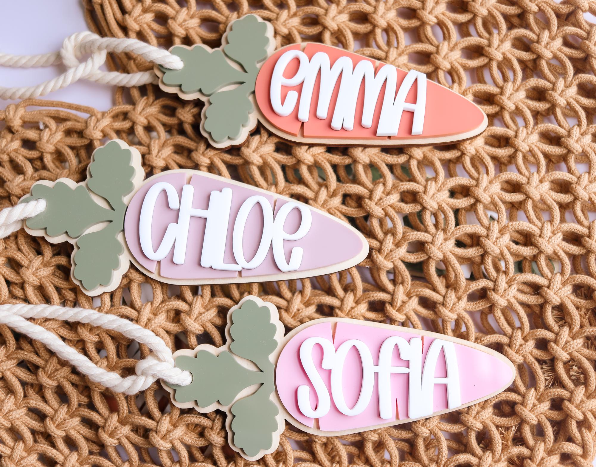Each tag is laser cut and layered for a beautiful 3D look, featuring your child’s name in raised lettering and soft spring colors. Tie it onto baskets, gift bags, lunch boxes, or even bedroom doors for a cute seasonal accent that can be reused year after year.