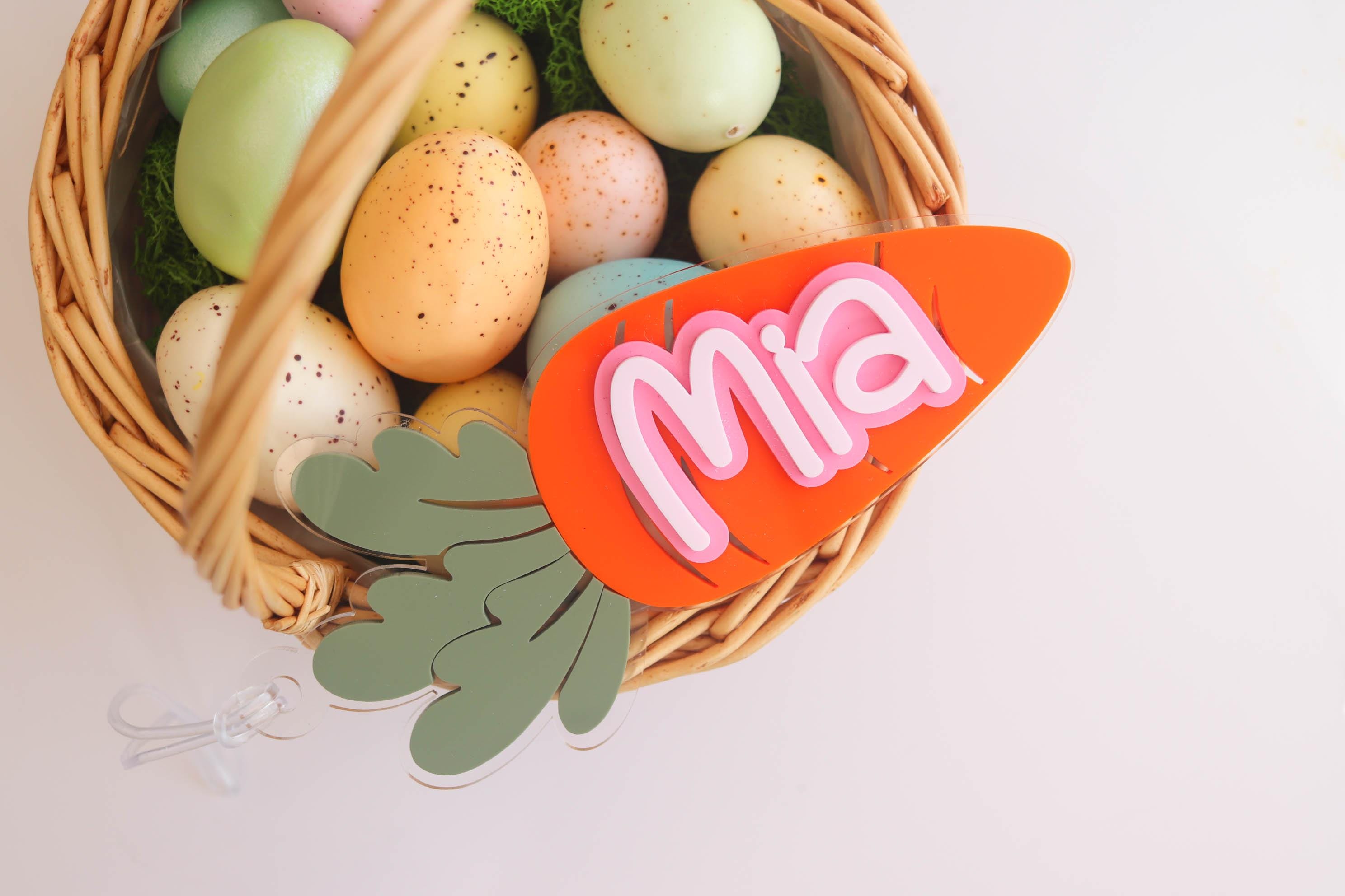 Each tag features a bright carrot design with dimensional lettering and leafy green details, creating a fun and modern look that kids love. Simply attach it to any basket for an instant personalized Easter surprise.