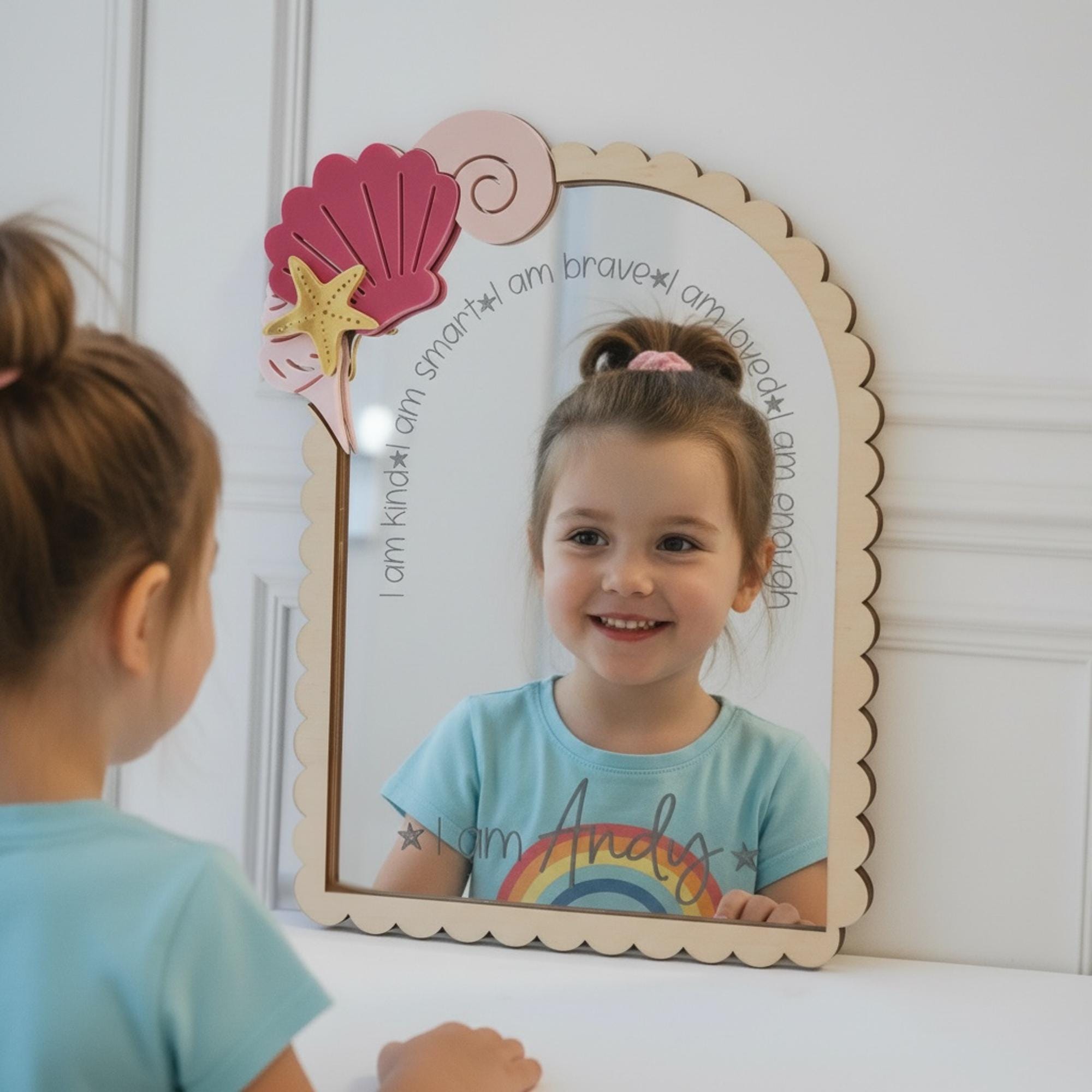 Featuring uplifting phrases like “I am kind, I am smart, I am brave, I am loved, I am enough” — plus their name beautifully displayed — this mirror becomes a daily moment of positivity and self-love 🌈