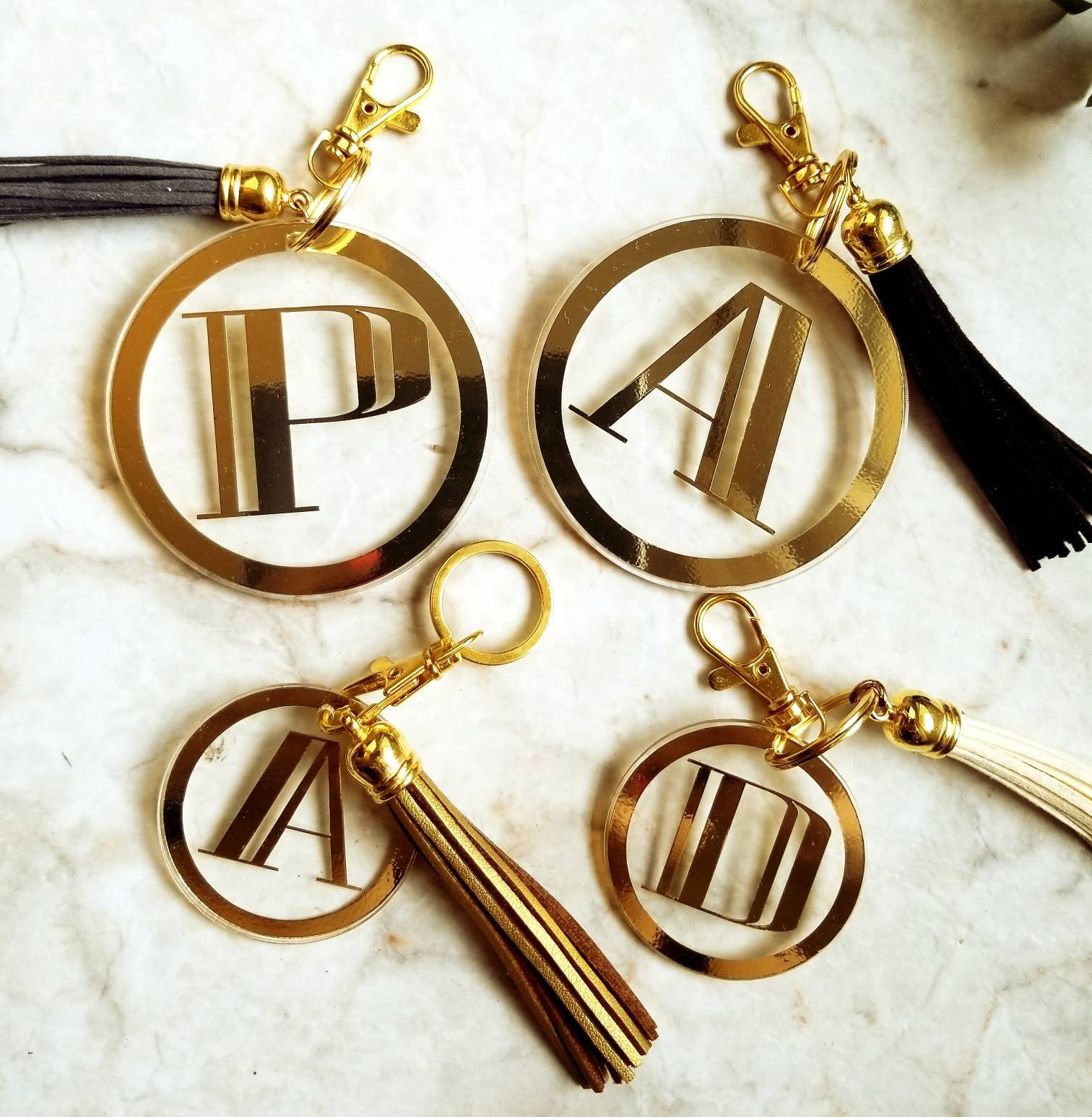 This beautiful custom key chain is made of acrylic cut off and high quality vinyl, You can select between Gold or Silver metal finish for the key chain, hook and tassel head.beautiful double-faced satin ribbon and you select between ink, solid vinyl or glitter vinyl for the writing... .