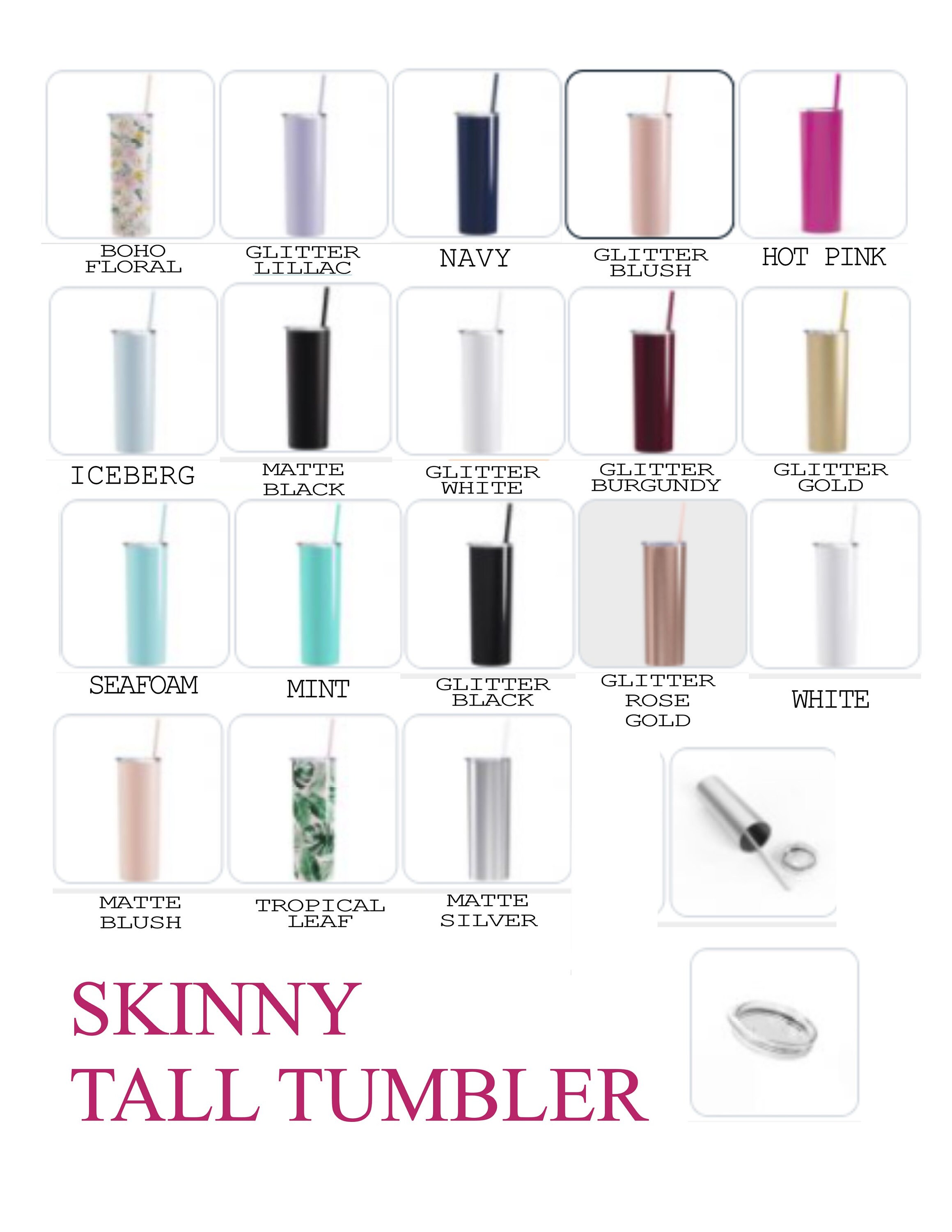 **TALL TUMBLER 20oz: Matte Black. Silver, Glitter White, Glossy White, Rose Gold, Marble, Glitter blush, Glossy Navy, Glossy Mint, Tropical, Geode Purple and Glossy Seafoam. Shimmer Gold, Matte blush, Glitter Lilac.